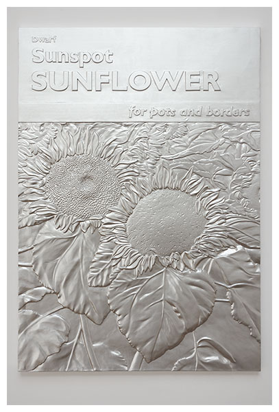 Charles Ray’s humorous and witty work Sunflower Relief , sitting nearby, is a machined, solid-aluminum form of a garden center seed packet. Playing on the word ‘relief’ by referring to both of its meanings, Ray makes a commentary on the materialization of high art as he neutralizes the meaning of the word. The sculptural technique of antiquity is contrasted with its primary meaning in the English language, asking questions about the reassuring aspect of art, and the occasional absolutism applied to the formats and techniques of contemporary practice.