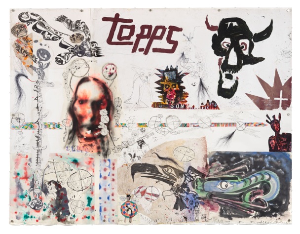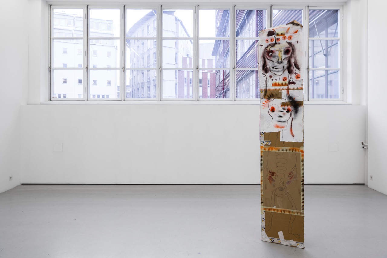 Kahlhamer’s work springs from a personal place, an exploration of his own ethnic and cultural identity; he is born Native American and was adopted at a young age by a German-American family. His Native American heritage permeates his practice, not only through visual aspects like colors, patterns, and symbols like headdresses but also the materiality of the work’s spiritual components, like his totem poles and models figured on Hopi and Zuni Katsina dolls. The Native American aesthetic is always juxtaposed with urban street culture and/or a distinct American aesthetic such as brand logos, landscape or wildlife, as well as pop and rock-cultural references. Kahlhamer has a professional background as an art director for Topps Company; the manufacturer of confectionaries like “Push-pop” and “Bazooka” bubblegum as well as collectible games and trading cards, and he has also created album covers for indie rock-bands The Kills and Man Man.