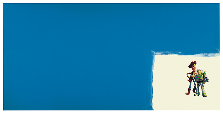 Fifteen of Majerus’s paintings made between 1994 and 2002 are on display at 522 West 22nd Street. They are large in size and comprise the vibrant colors found in both Minimalism and Pop with clear stylistic references to the work of Warhol and Basquiat, as well as other pop-culture elements. Next door at 526 West 22nd Street is an installation made of thirty-six small square paintings made in a variety media. There are also larger paintings executed in enamel on aluminum that portray characters from the 1995 film Toy Story made in Majerus’s usual coupling of abstract expressionist painting techniques with cartoon-character like renderings.
