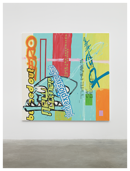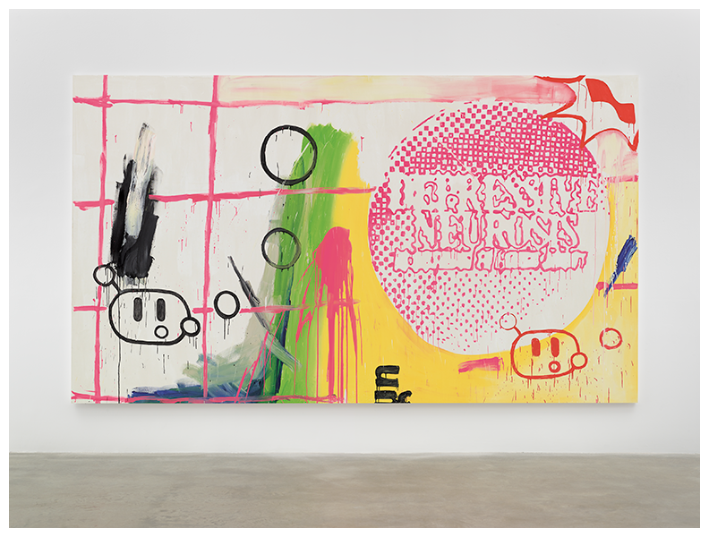 Uniquely spread over the three gallery spaces, this exhibition highlights Majerus’s constant dialogue with pivotal twentieth century artists and pop culture signifiers in turn, as well as moments when the two collide. Through the variety of mixed media canvases and installations we can see references to de Kooning’s whiplash brushstrokes, Basquiat’s graffiti-inspired canvases and Warhol’s obsession with pop culture. This is all done in Majerus’s distinct hand, incorporating the visual codes that so influence everyday life in an evolving Information Age.