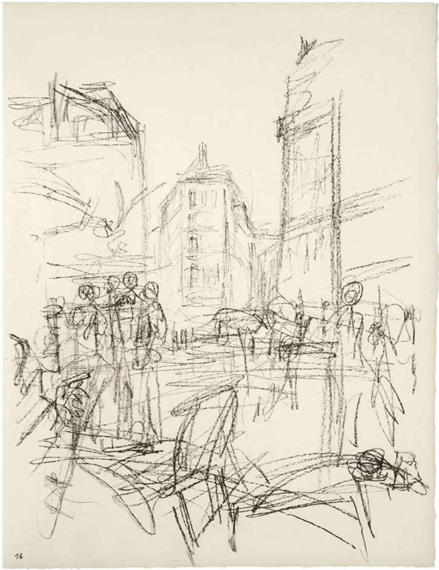 Whereas Léger’s book of lithographs depicted Paris as an urban, bustling city, Giacometti elected instead to portray his daily life with quick sketches of familiar places: his studio, cafés, and at the printer Mourlot’s new shop, for example.  The result is a seemingly boundless trove of scenes and drawings, rendered in Giacometti’s flowing, vibrant hand.  Portraits of close friends mingle with bustling street scenes, and throughout, Giacometti’s keen eye for space and angle is present.