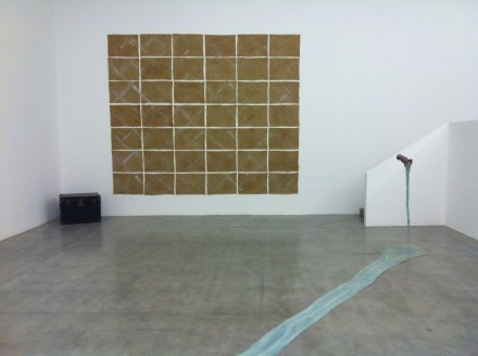Jetzt fliesst das Wasser aus der Vase, another sculptural work, underlines the artist’s interest in fluidity, movement and nature, and presents a notable diversity in the content of the exhibition with its lighter, more humorous aspect. Covering a another massive piece of the wall in the main gallery is Parquet floor of study in Winterthur-Wüfligen, the artist’s recreation of her family house’s floors in tile-like latex sections. She strengths the nostalgic atmosphere of the piece by incorporating a large trunk, in which these sections can be stored and transported.