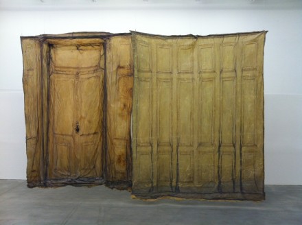 On a different note, the exhibition also includes Grande Albergo Brissago, a colossal replica of the main entrance to the Swiss hotel of the same name in Brissago, Switzerland. Combining different materials such as PVAC glue, textile and gouache and her signature latex, the artist recasts an important icon of Swiss neutrality, a safe space where many of Europe’s intellectual class waited out World War II in peace.