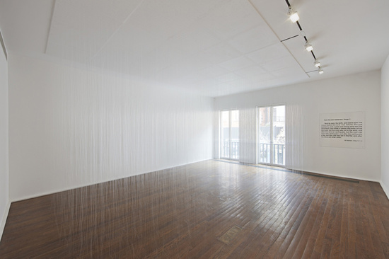 But perhaps the most impressive piece comes in the front room of the gallery’s second floor, a full-room installation of thin nylon thread titled Still waves of probability. Spread thickly across the room, the threads of the work brush against each other, constantly moving with the the air currents and light of the room’s large, street-facing window. Softly floating in space, the work makes passing light into a compositional element, and distinct lines of soft white are detectable across the “surface.”