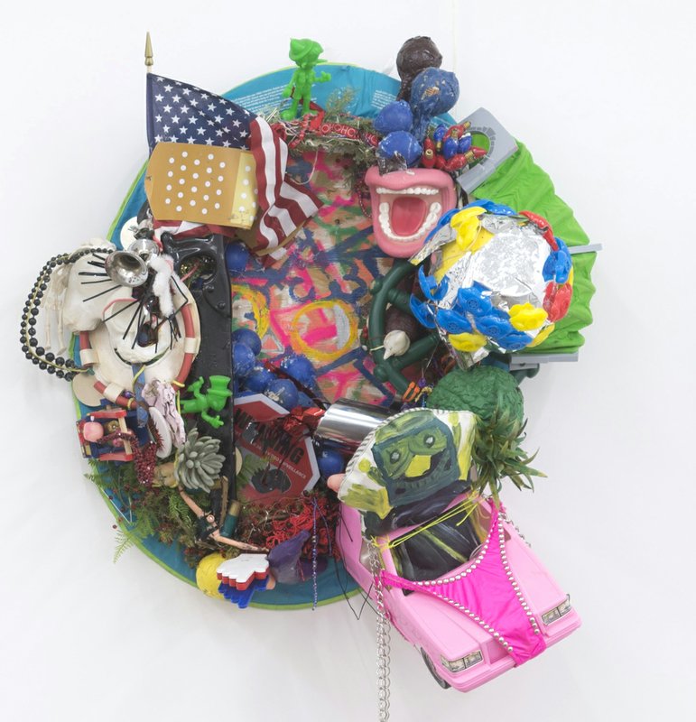 In another corner, Agathe Snow is showing a series of recent assemblage pieces, culled from children’s toys, cultural detritus and scraps of garbage. The roughshod appearance of the pieces is challenging, to say the least, offering a wealth of material for the viewer’s roving eye, while insisting on some sense of overall formal coherence. Even while she pulls from the myriad sources that her messy, comically vivid works imply, the pieces boast a sense of totality, balanced somewhere just below sensory overload.