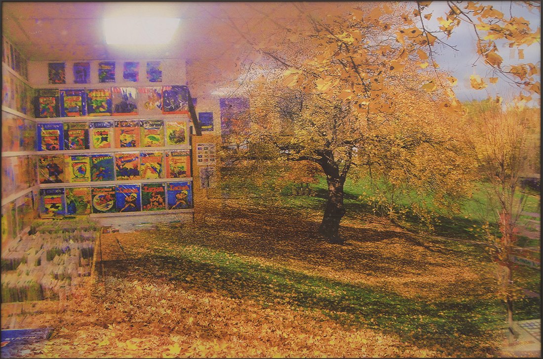 Splitting the difference between these two is photographer Willy Le Maitre’s series of surreal digitally collaged photographs. Juxtaposing images of highly mediated, commercialized culture (the Google Street car, comic book stores, neon-toned lawn chairs) with images of empty, flowing fields and gently bowed tree branches, a contrast lent all the more weight by the analog aesthetic of his digital editing work. Locked in a world of intense digital cataloging and back-to-nature rhetoric, Le Maitre’s photographs feel like a refreshing apology, negotiating between the two using the nostalgic imagery of double exposure photography.
