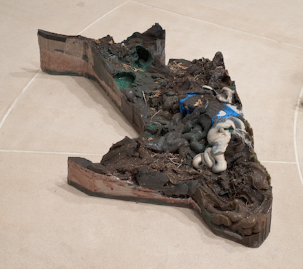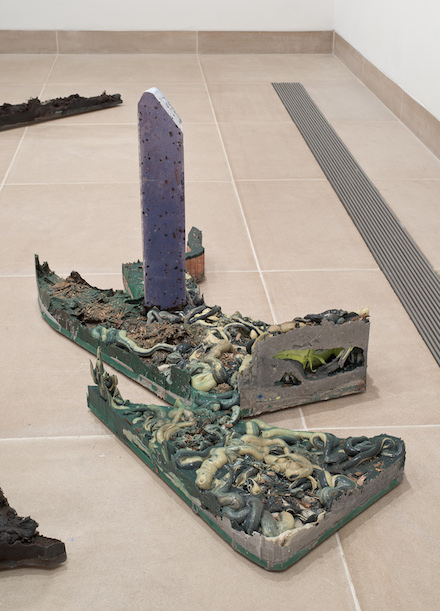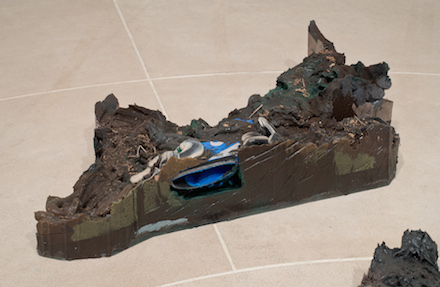 The work on view consists of a series of mixed media sculptures made of found objects, cement, plaster, marble, and wood, exuding the artist’s sensations of melancholy, memory, nostalgia, and the apocalyptic surrounding her conceptions of the end of life. Ursuta actively avoids cemeteries, but makes imaginary visits to graveyards “as a cathartic exercise,” and for the 2012 Frieze Art Fair’s Projects section she constructed a graveyard with marble tombstones carved into abstract shapes. In this exhibition, the gallery has been turned into a different kind of graveyard,where each “tombstone” casts cross sections of what lies below the ground,rather than shadows.
