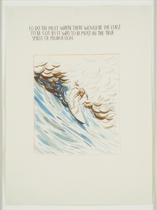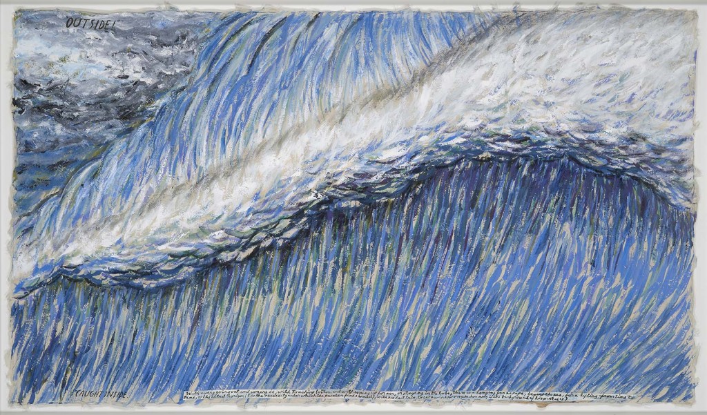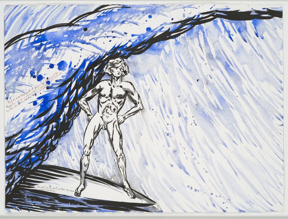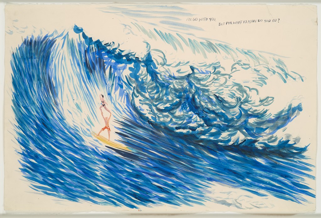 Pettibon lives and works in the beach town of Venice, California, but he is not a surfer himself. The works can’t be classified as “surfer art” either, as they don’t represent any specific surfing scene, but rather an homage to the American icon as a symbolic meaning for Pettibon’s own personal journey. With these works, Pettibon visits and revisits the concept of “the life of an artist…ego and fame, naiveté and bravery, loneliness and mortality.”