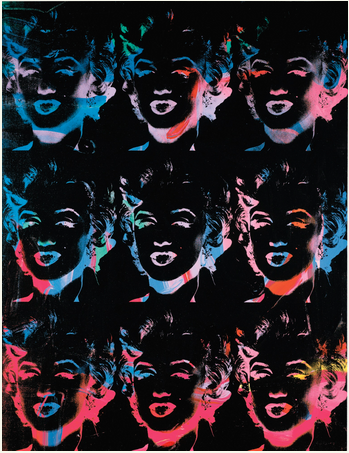 Andy Warhol, Nine Multicoloured Marilyns (Reversal Series), via Sotheby’s