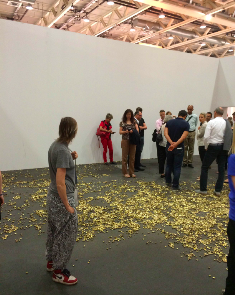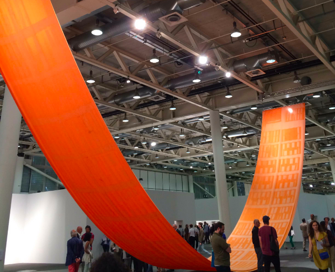 The Art Unlimited booth also commanded impressive attention, as curator Gianni Jetzer poured new life into the freshly renovated space of Hall 1. In one corner, Haegue Yang of South Korea’s Kukje Gallery had hung an enormous, delicate series of fabrics, creating swirling, angular patterns that left viewers walking by with their heads crocked upwards. Nearby, Giuseppe Penone’s immense row of bronze tree sculptures was equally eye-catching. The space was unified by a 100 meter long floor work by Carl Andre, consisting of steel plates running through the space, and inviting visitors to walk on top of it to experience the exhibition from atop Andre’s material.