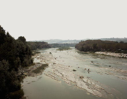 Niagra Falls (1989), for example, exposes a popular tourist attraction from a bird’s eye view. Instead of being a tourist photo itself, the landscape includes a tourist boat in the photo, full of visitors wearing black rain gear, heading toward the immense crashing waters. Mettmann, Autobahn (1993), in contrast, displays a peaceful scene intersected by grey bars, which hold a Plexiglass screen that act as a noise barrier along a motorway. In another work, Alba (1989), Gursky depicts a still river and a stony riverbed through which fishermen wade, framed by a dark Italian forest. These images capture a particular time and place, in a way that transcends the experiences of the places and instead represents an outsider (or “extraterrestrial”) perspective.