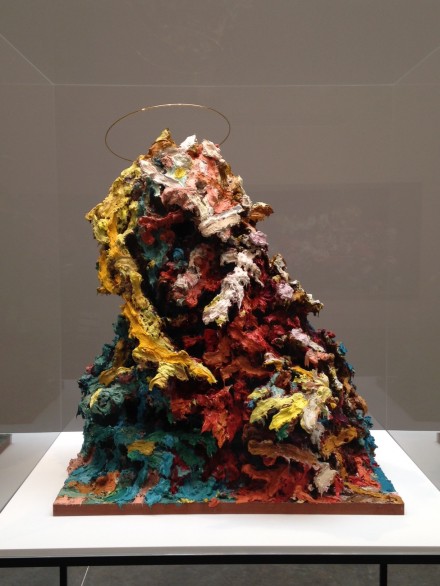 Brown’s sculptures, on the other hand, elevate the multi-layered nature of paintings to the level of three dimensionality, turning Brown’s heavily piled oil paint into a sculptural technique in which it replaces common materials such as clay or bronze. Infusing a curious playfulness into his argument, Brown covers antique bronze figures with the same technique, transforming what is of the past into a matter of the contemporary. Still leaving the traces of the past selves of these statues visible amongst the colorful piles of paint, be it a pair of legs or a halo, Brown makes a salute to the traces he’s following as an artist contributes to the emblematic state of today’s art.