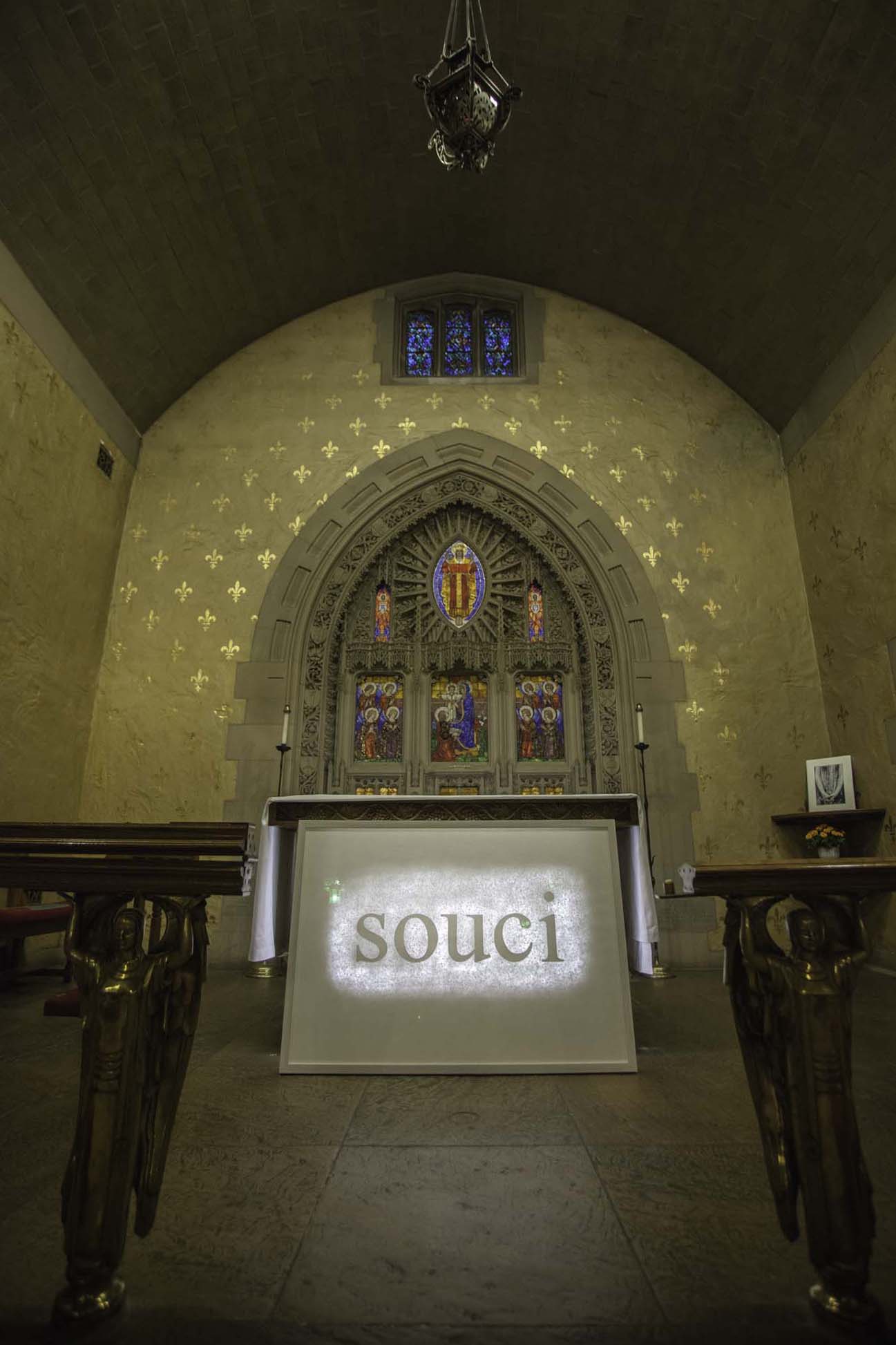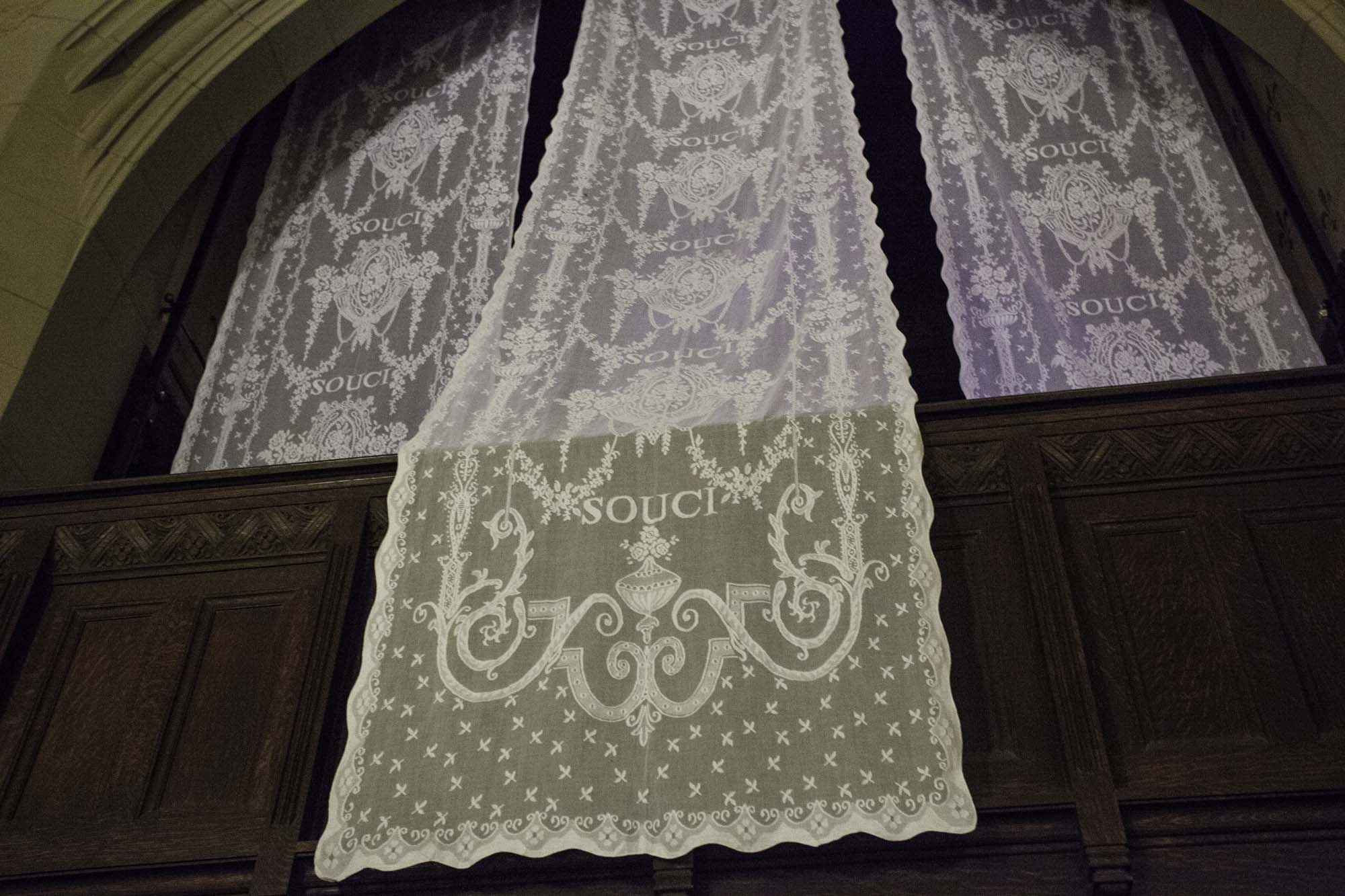 The show is physically dark, with large, looming lamps hanging from the ceiling as the only light sources, along with the bright, digital blue of the projected recording of Sindler’s final moments, which Calle recorded in 2006. Hundreds of fleur-de-lys painted in gold on the walls reflect a small amount of light, producing a haunting, shimmering effect. The room is also extremely quiet, save for the soft murmuring of recorded English translations of excerpts from Sindler’s diary, which she wrote from the 1980s through 2000. The word souci, the French word for “worry”, was the last word her mother said, and it appears persistently in the space, whether glowing on the pedestal at the front of the aisle, or subtly woven into the lace that covers the organ on the upper level on the other side of the room. On one wall, the word is formed by a collection of pinned butterflies. The conjured atmosphere of this show calls upon the empty, somewhat disconcerting serenity of the massive church in which it exists.