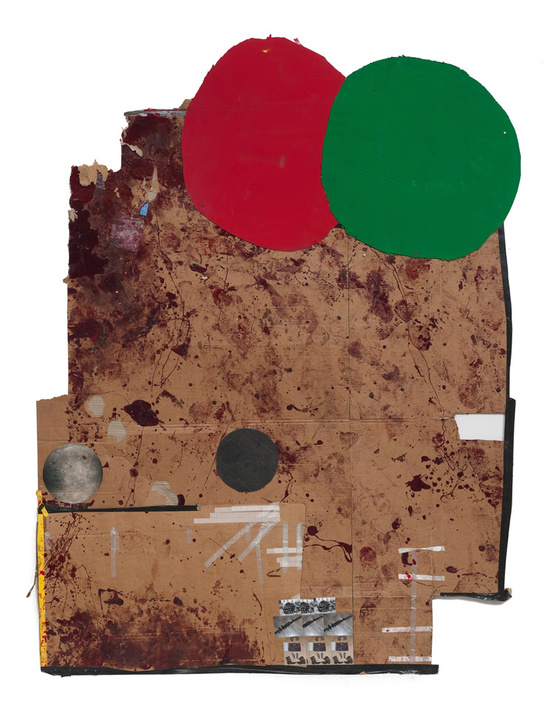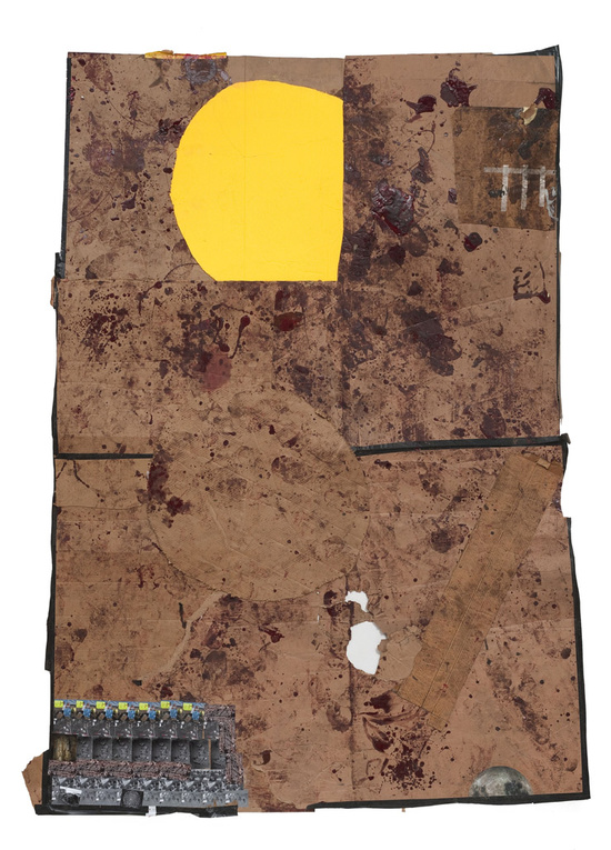 Sterling Ruby, SUNRISE SUNSET (Installation View), via Hauser and WirthBut this same scrambled assemblage of works plays nicely against the materiality and presentation of Ruby’s signature techniques, a blend of dystopian, freewheeling collage and meticulously process-oriented sculptures.  Little is wasted in Ruby’s works, and the variety of pieces on view speaks to his all-encompassing studio language.  In one of the show’s centerpieces, The Cup, an enormous urethane-encrusted sculpture literally overflows with its own ominous red material.  Ruby takes the act of creating the sculpture, as well as its corresponding work Pillars, to dot his works throughout, with splatters of red caking his mounted collages, or appearing as a reference in the work ACTS/SOME RISE SOME REST, an impressive set of cantilevered slabs that Ruby’s battered aesthetic with the graceful movements of dye frozen in a transparent block of urethane.