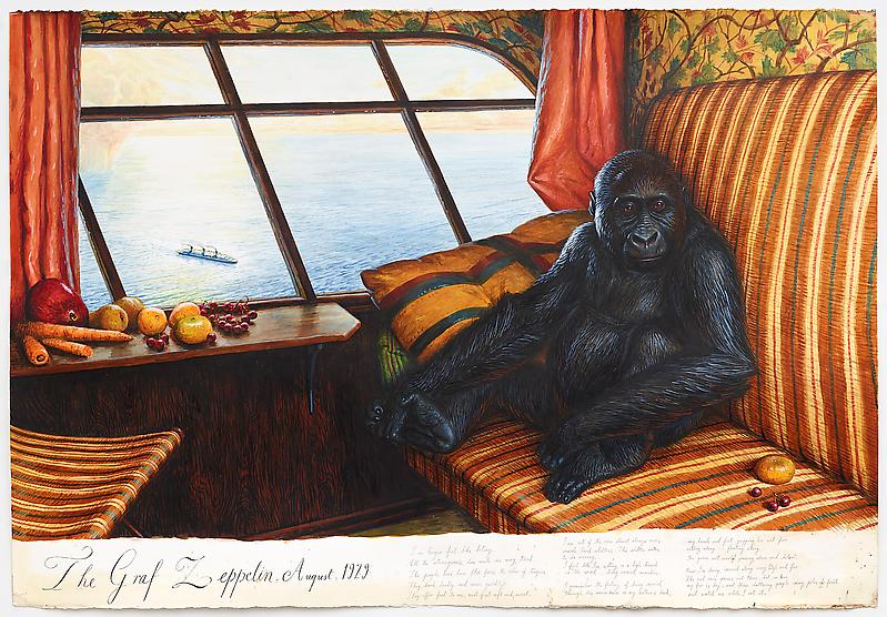The Graf Zeppelin (2014) tells the story of Susie, the first female gorilla brought to the United States. She was brought in a first class cabin of the German airship in 1929. The work includes a written account of her observations and state of mind, as imagined by the artist, blending a bizarre animal perspective with classic still-life and portraiture tropes to create a surreally timeless environment. Similarly, Windsor, May 1829 (2014) depicts “Happy Jerry,” a mandrill who lived in Edward Cross’s menagerie in London during the early 1800s. The image Ford has painted comes from a description by Adam White in his 1870 book Heads and Tales, depicting an image of Happy Jerry siting at a table, drinking port, smoking a clay pipe and eating a meal with King George IV. This work also includes Ford’s written perspective of Happy Jerry’s feeling.
