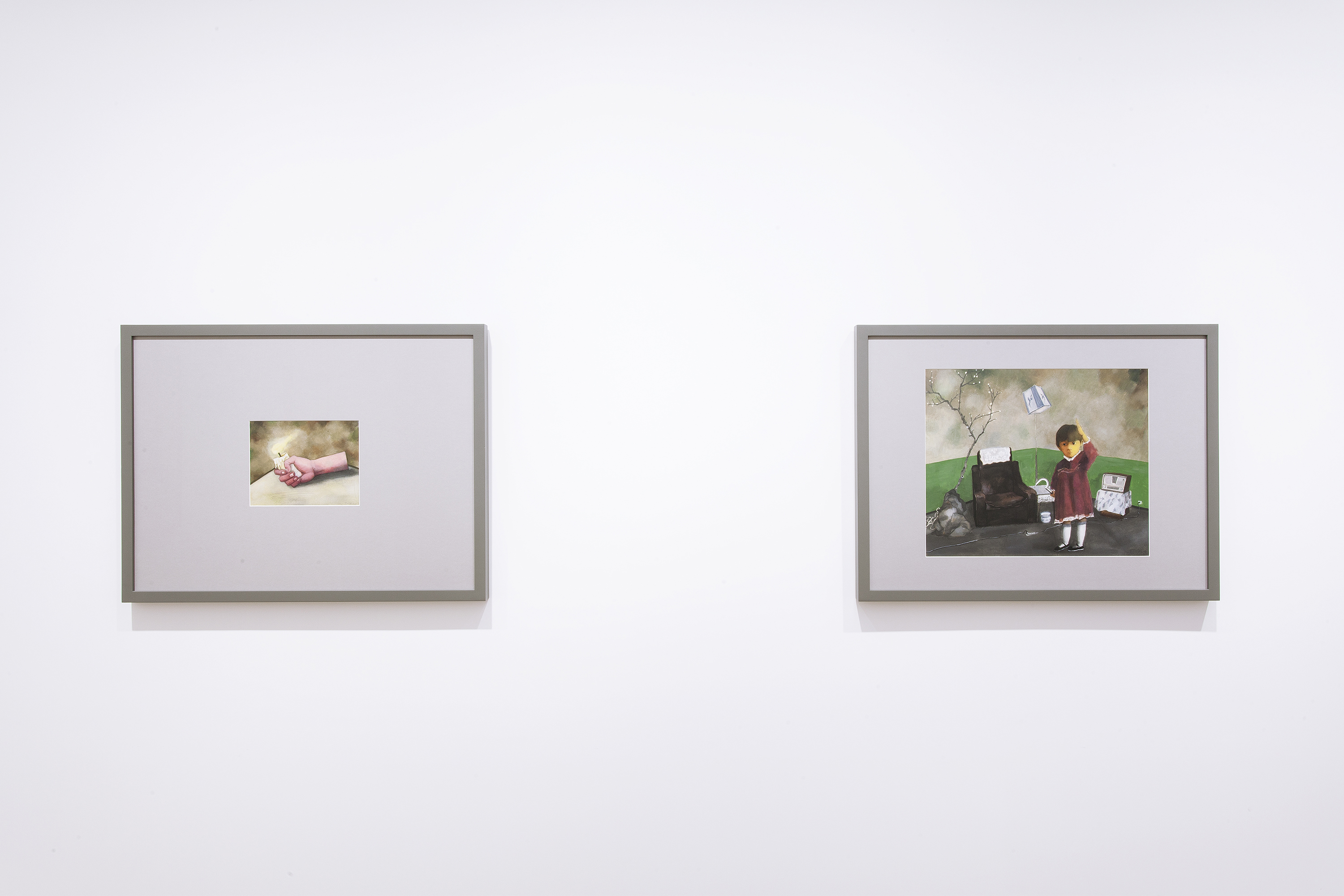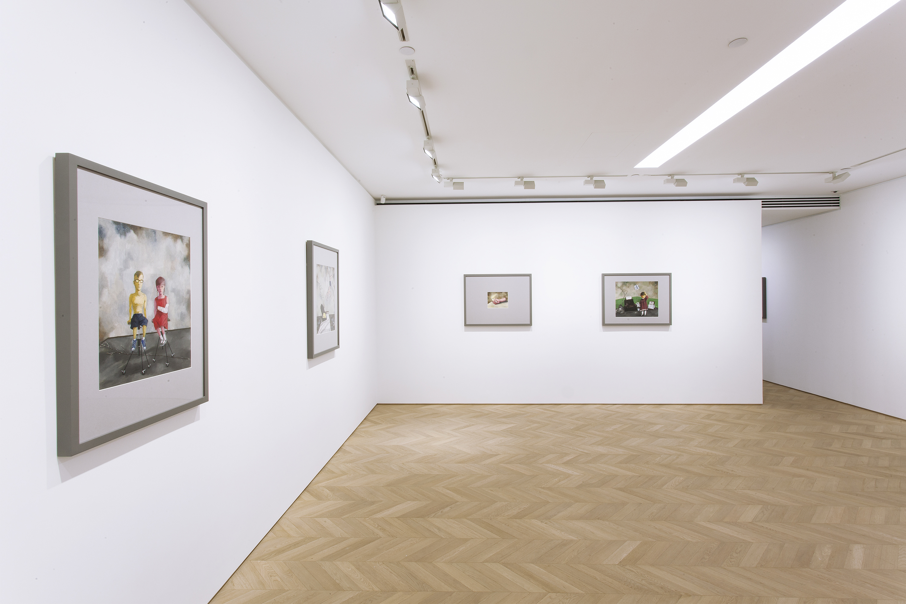 On view until July 12th at Pace Gallery’s new Hong Kong location is Xiaogang’s new body of work. Revisiting the subconscious, remembrance of the past and contemplation of the surreal are among the ideas the artist draws inspiration from. Referring to the European style of painting that left a major impression on the artist during a stay in Germany, Xiaogang orchestrates his figures to emphasize their existentialist dilemmas and emotional fragilities. Constructing dream-like ambiguous stories maneuvering around reality and fiction, Xiaogang’s paintings depict human figures in different positions and environments, infusing a strong sense of surrealism into his argument, while narrating an array of visual narratives. Among his characters are a yellow-headed man curled up on a sofa, shadowed by a dried tree. In another a girl with a cast and a boy are quietly sitting on stools, while nearby a naked man floats over a body of water full of TVs, radios and other devices.