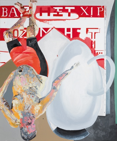 Martin Kippenberger’s inverted self-portrait, on the other hand, reveals the complicated tug-of-war at work in the relationship between influence and influenced. In Untitled, 1992, the artist references his German contemporary Georg Baselitz as an institution of the artist as hero. Kippenberger attacks this inflation of ego that he sees depicted in the work of Baselitz by parodying his 1976 self-aggrandizing portrait.