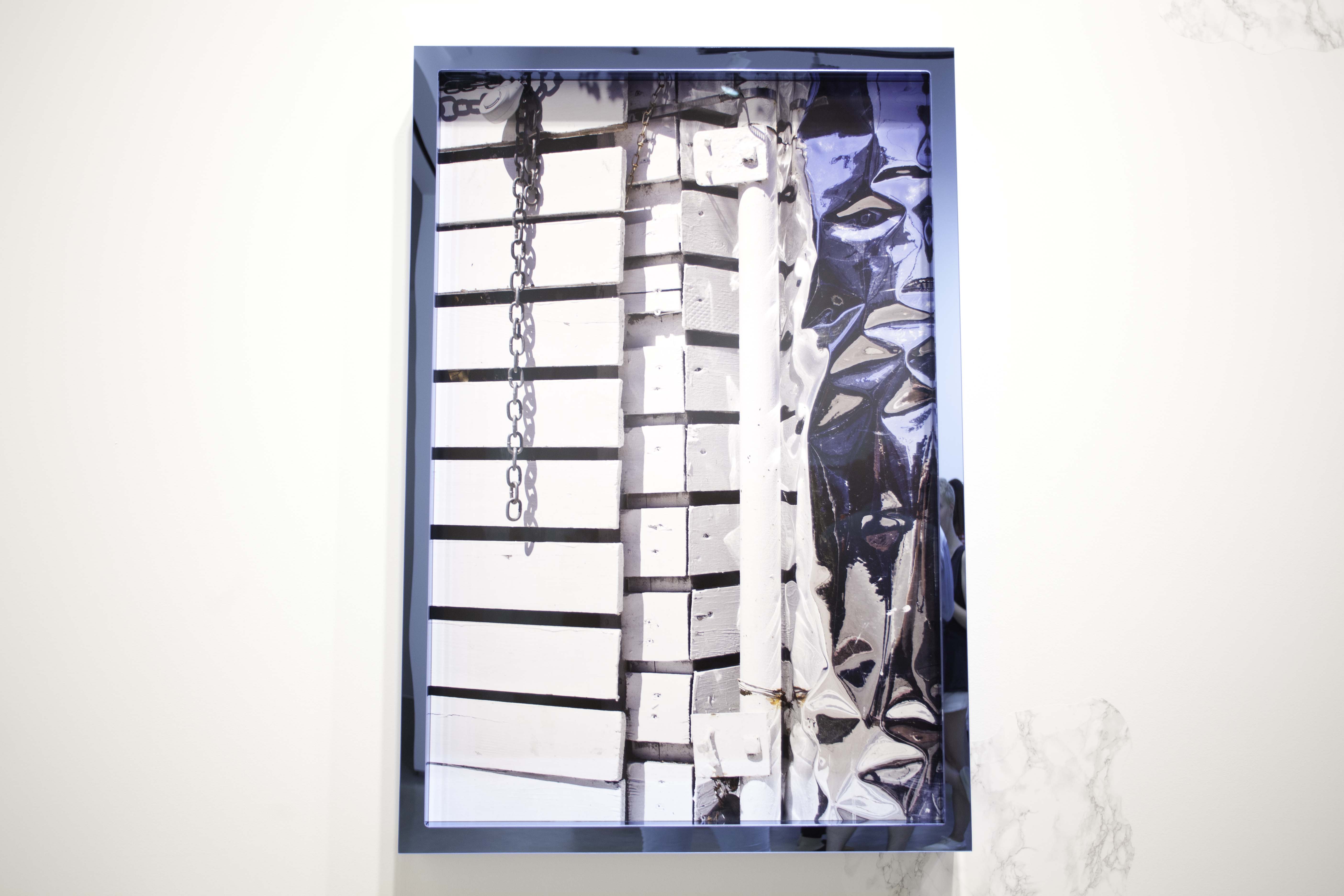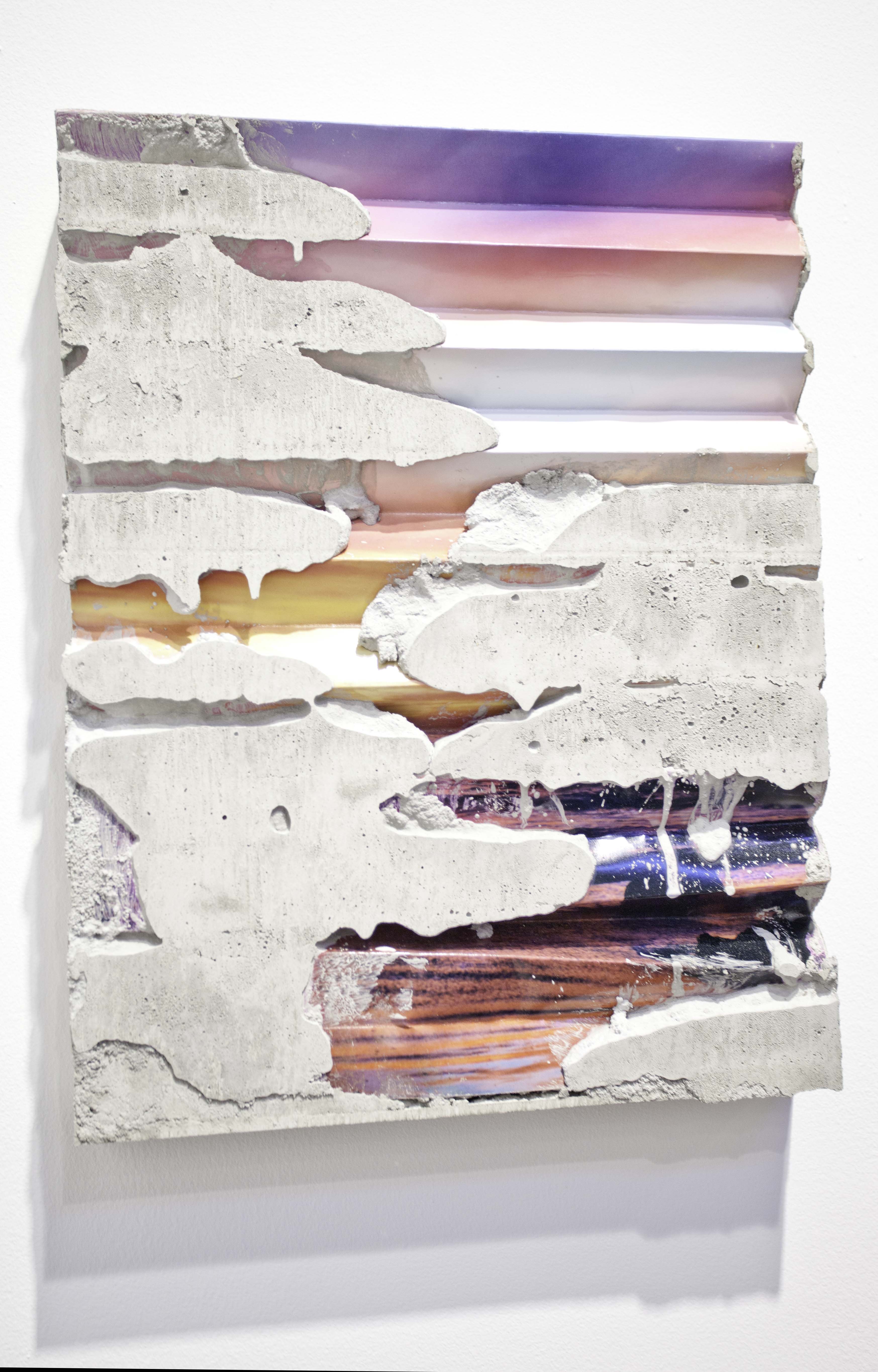 What’s perhaps most intriguing about this collection of work is the thread running through the show, the marriage between the physical and the digital: a marriage that has happened so recently in photography and in sculpture respectively. John Houck, for example, created software to create the kind of digital effect he wanted to produce in his artwork. He then physically folds the printed piece, imprinting a physical human artifact into the work, and leaving it suspended between a carefully hand-crafted object and an algorithm driven piece. Letha Wilson’s process involves photographing landscapes in the American West, and then physically altering them in such a way that they become their own landscape. She then adds a textural element by, for example, pouring concrete onto the façade of the newly formed, photographic object.