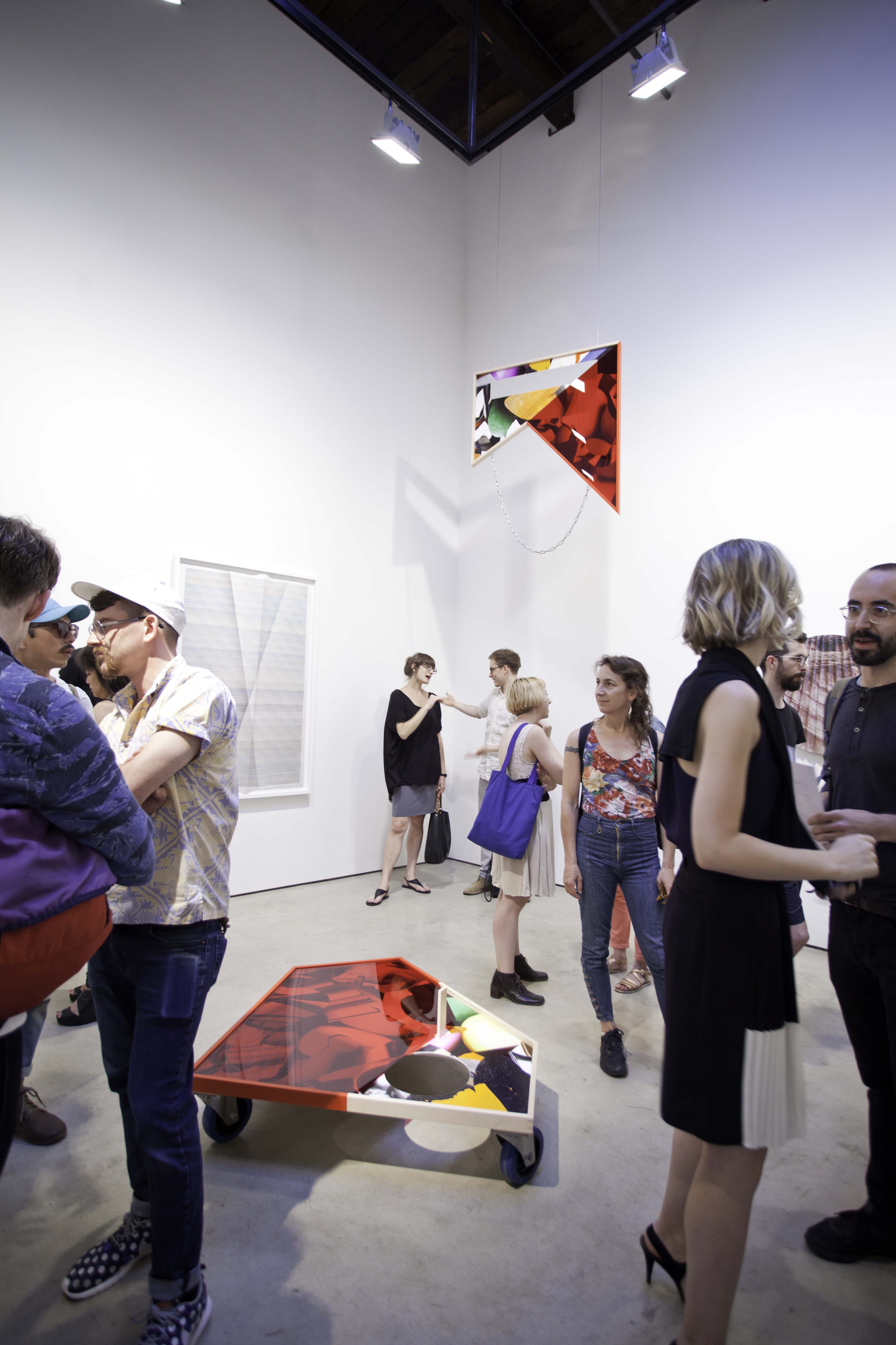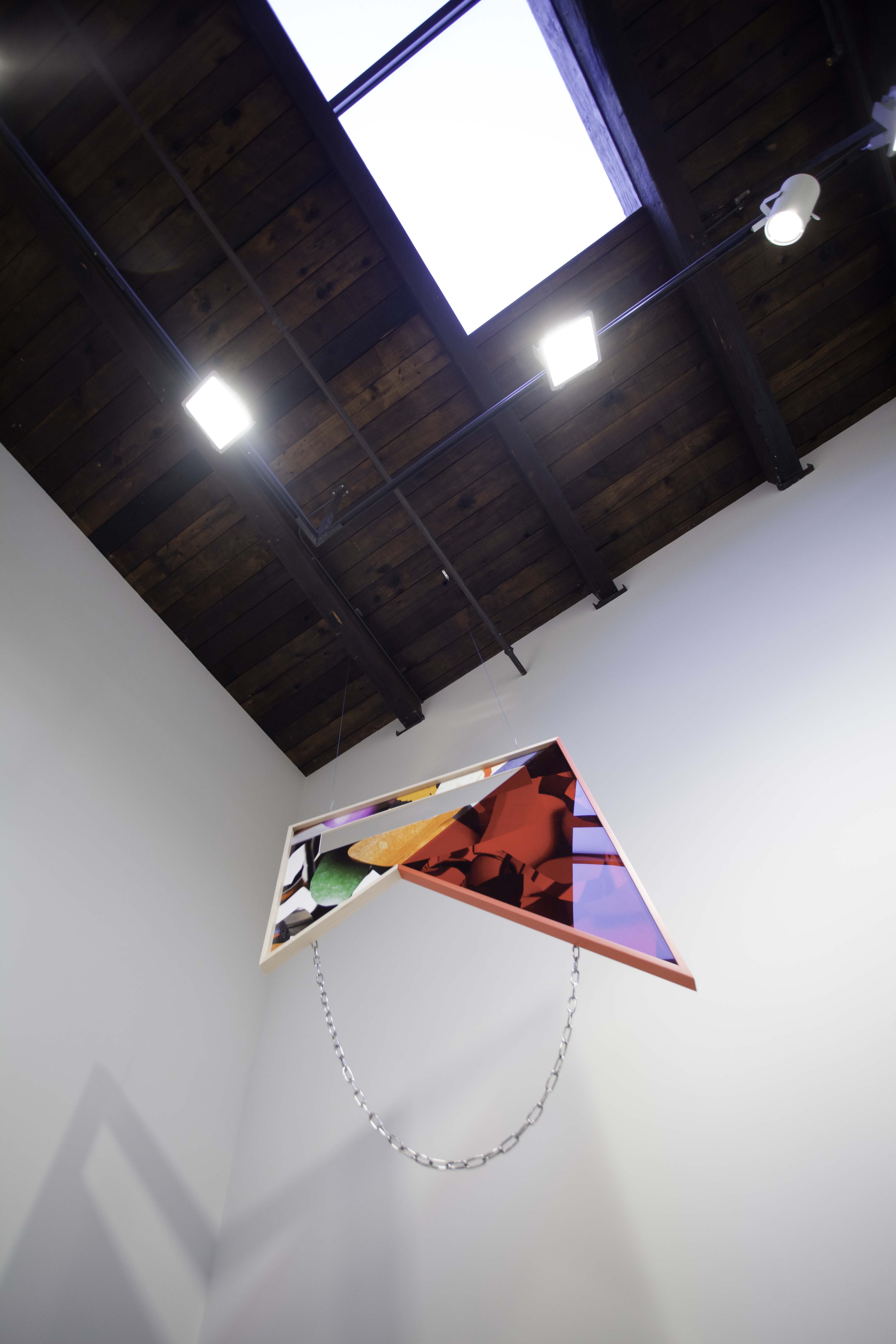 Another such oasis in the crowd was caused by a two-part piece by Katie Steciw. One “half” of the work hung in the corner of the gallery space, quietly suspended far above the crowd, with a chain hanging from its colorful geometric sculpture as though reaching towards the second half of the piece, which stood a few inches above the concrete floors on wheels. The work is easily movable, yet frozen still, untouched, in the context of the art gallery.