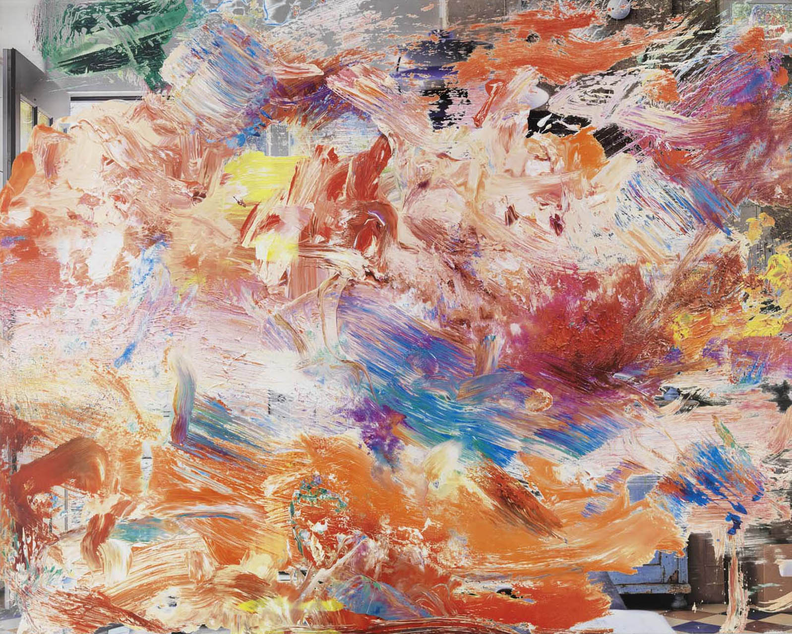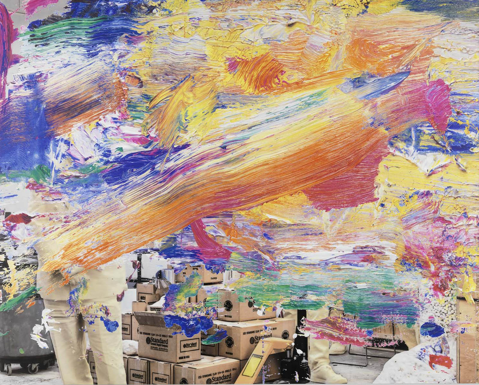 The results on view are far from representational, blending vivid brushstrokes and fluid movements across manipulated photographic material.  Turning his painterly aspirations towards abstract expressionism and modernist explorations, Fischer achieves something of an abstracted trompe-l’Å“il. Beginning with a digital photo of various studios and spaces Fischer has inhabited between Los Angeles and Berlin, Fischer blurs, obscures and warps the final product, creating works call to mind the practices of the Dada movement, the Situationists or even the more ubiquitous screen-prints of Andy Warhol.  The end result is actually a photographic reproduction, carefully smoothing over the wild surface of the piece to create a clean, tightly rendered abstraction in the surface of the image.