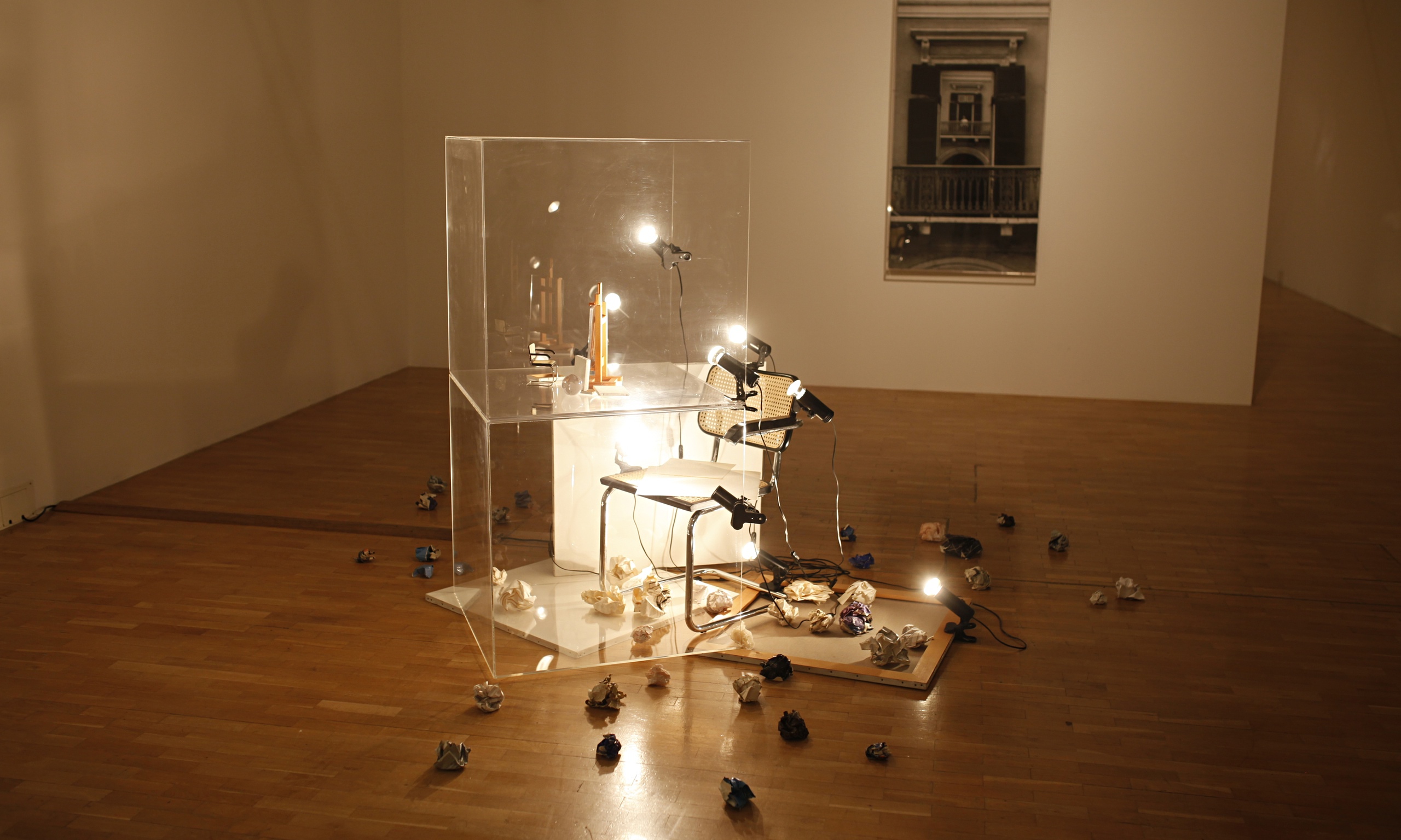 The way the artist positions himself inside the painting, physically present yet with his face blocked by the presence of the wooden stretcher, proposes Shakespeare’s or Barthes’ arguments related to the boundaries of existence and omnipresence, both as an individual and a creator. Similarly, Big Bang, an installation from the 90’s containing an empty seat suggesting the presence of the artist, crumpled sheets of paper showcasing different ideas going into refuse and an easel standing out as the symbol of artistic creation, embodies the dilemmas a creative mind is constantly engaged with, placing an artist’s studio and artistic mind inside a Plexiglass box.