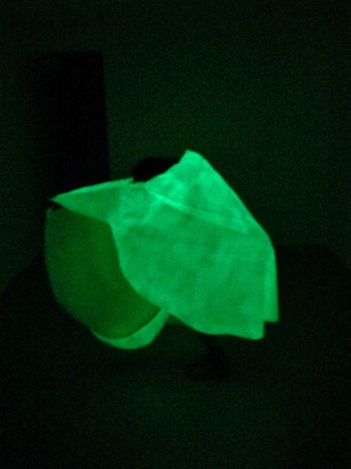 In exchange with the space, Huyghe also made a point of allowing the insects their own agency. Each time an insect passed over an installed electromagnetic device, the gallery’s lights were momentarily suspended and the viewer was plunged into darkness. This created an opportunity to behold Huyghe’s radiant glow-in-the-dark work, Dress For Radium Dance. The gown in the work was inspired by a garment worn by dancer Loie Fuller during a private performance that she gave for researcher Marie Curie. The dress was made in Curie’s lab out of phosphorescent salts, and is coated with a waxy, phosphorescent finish which allowed it to appear brightly in the dark.
