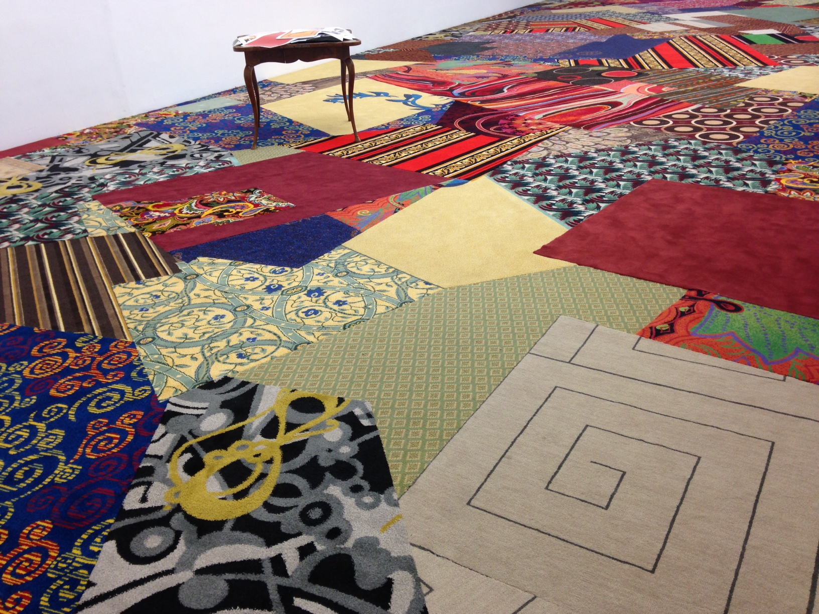 Gambling, a phenomenon strongly relying on the notion of risk taking by nature, seems to be a fitting metaphor within the concept. Marcel Duchamp’s Monte Carlo Bond, a classic Duchampian parodical piece playing on a plot in which Duchamp is defrauding a casino, is a so-called legal document featuring a photo of the artist collaged with a roulette table by Man Ray as an overhead. Covering the floor from wall to wall inside the gallery is Cayetano Ferrer’s Remnant Recomposition, the artist’s composition of various carpets made especially for casinos. Blindingly vivid colors and bold design motifs on these carpets echo the puzzling state of casinos, with their never-ending mechanic noises and latent encouragement for constant squandering.