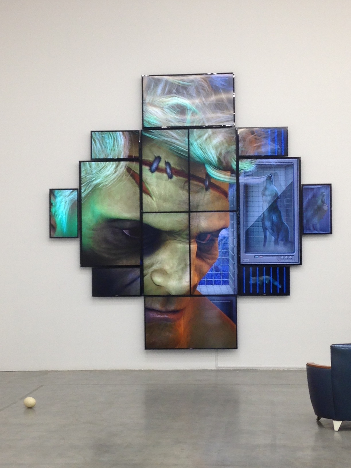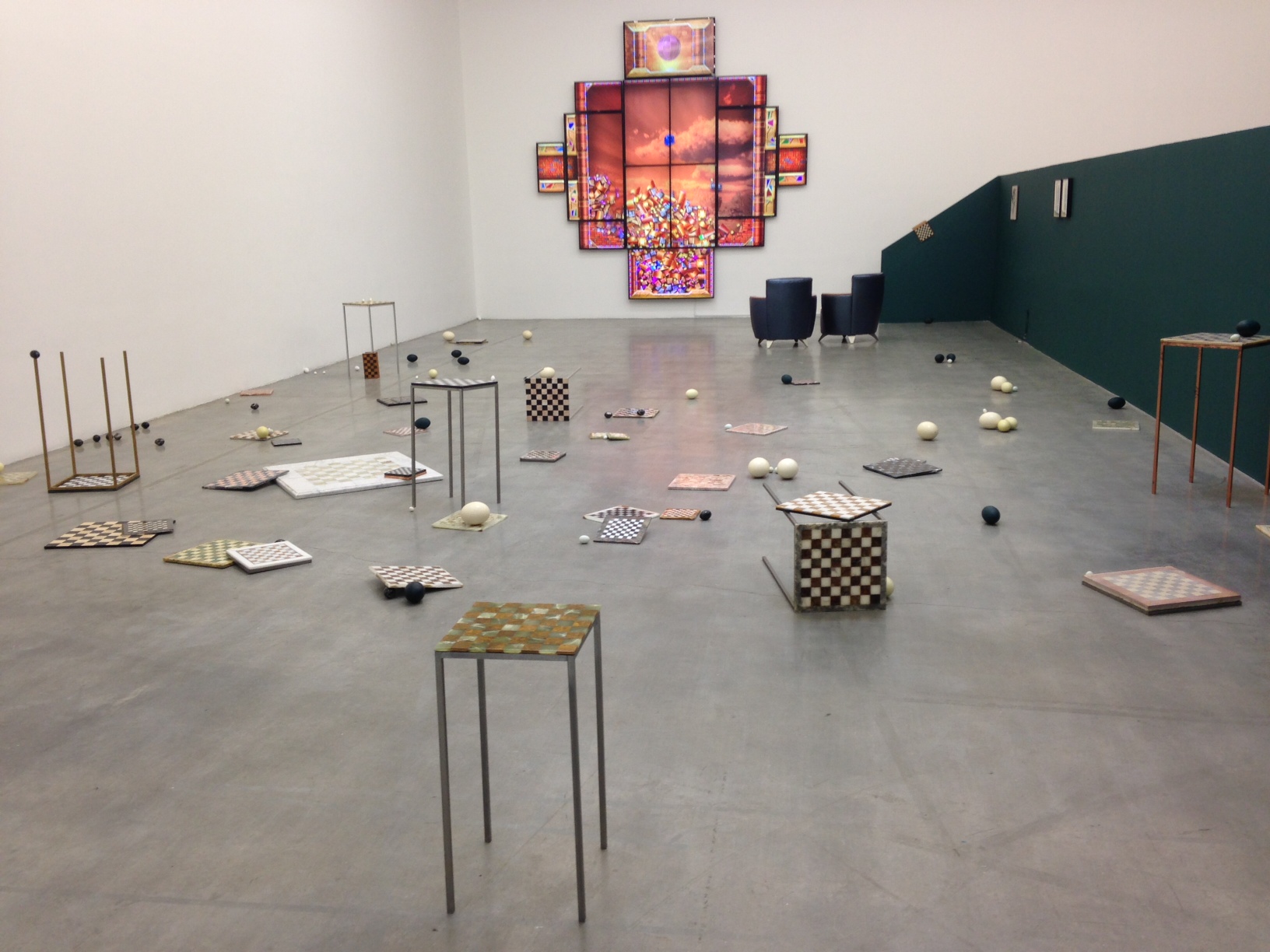 Upon passing Anselmo’s risk carrying piece, Sankt Petersburg Paradox,Sarah Ortmeyer’s large scale installation of chessboards in different mediums and eggs of various animals scattered around the floor, requires cautious movements from the viewers’. As a game heavily tied to the element of risk-taking, chess perpetuates the crucial notions of smart thinking and abrupt decision making. Eggs on the other hand bear a completely different yet familiar warning, being the factor of the mundane as well as a physical risk to be aware of. Among the works commissioned for the exhibition is Tabor Robak’s A*, a multi-channel video installation streaming a series of phantasmagorical images of fear, tension and thrill, resembling the graphics of a video game while not involving a player to control it.
