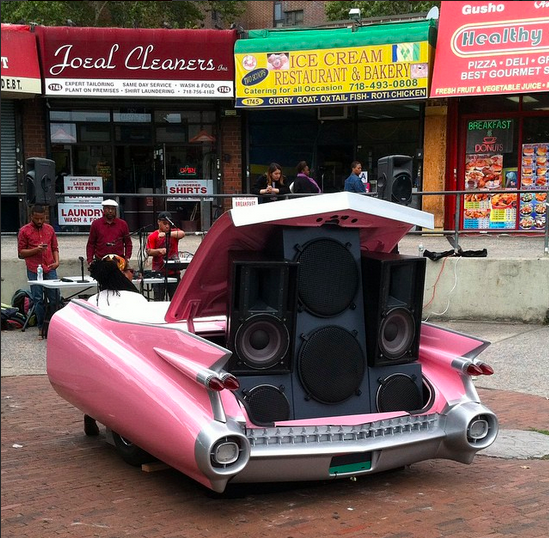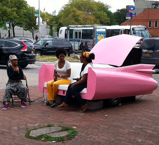 Over the past two years, Creative Time has worked closely with the Weeksville Heritage Center, creating a small but compelling series of community-based projects in eastern Crown Heights and Bed-Stuy. Each installation bears a studious commitment to the space it inhabits, while always looking out towards the broader community. This is perhaps best embodied by Otabenga Jones and Associates‘ OJ Radio, a public radio station broadcasting from the corner of Utica Avenue and Fulton Street. At its center is a modified tail section from a pink Cadillac, loaded with speakers and a backseat that doubles as an interview bench. Mixing live music and community dialogues, the work is public in almost any sense of the word, centering its discourse in real space while making its programming available to anyone with an internet connection around the globe.