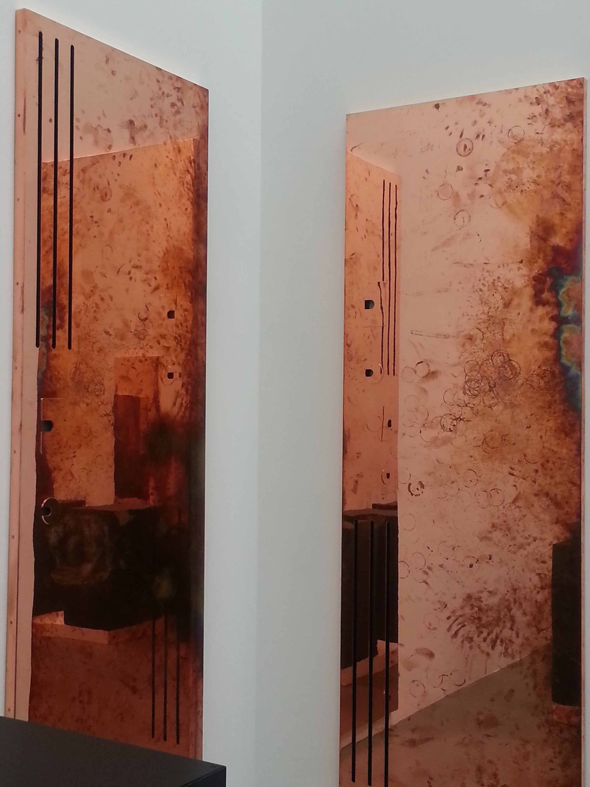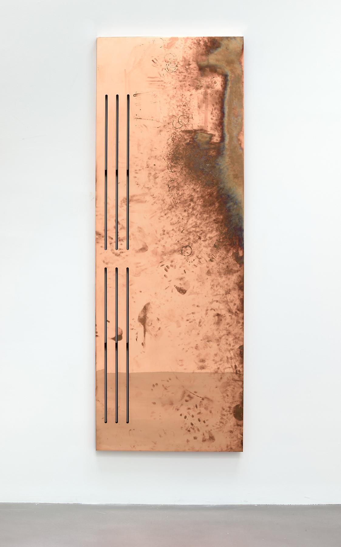 These copper panels are now installed as artworks on the walls of the gallery – a representation of the time and efforts spent by the staff of the gallery in which they are hung. The panels are thus meant to be a symbol of how function changes the meaning of work and an exploration of how purpose changes artworks over time. Turned on their sides, their roles have shifted from an active platform for working into a testament to the work itself. Using the interface as a recording mechanism, Beshty challenges perceptions of labor as a static, abstract process, and shows its real, physical remains.