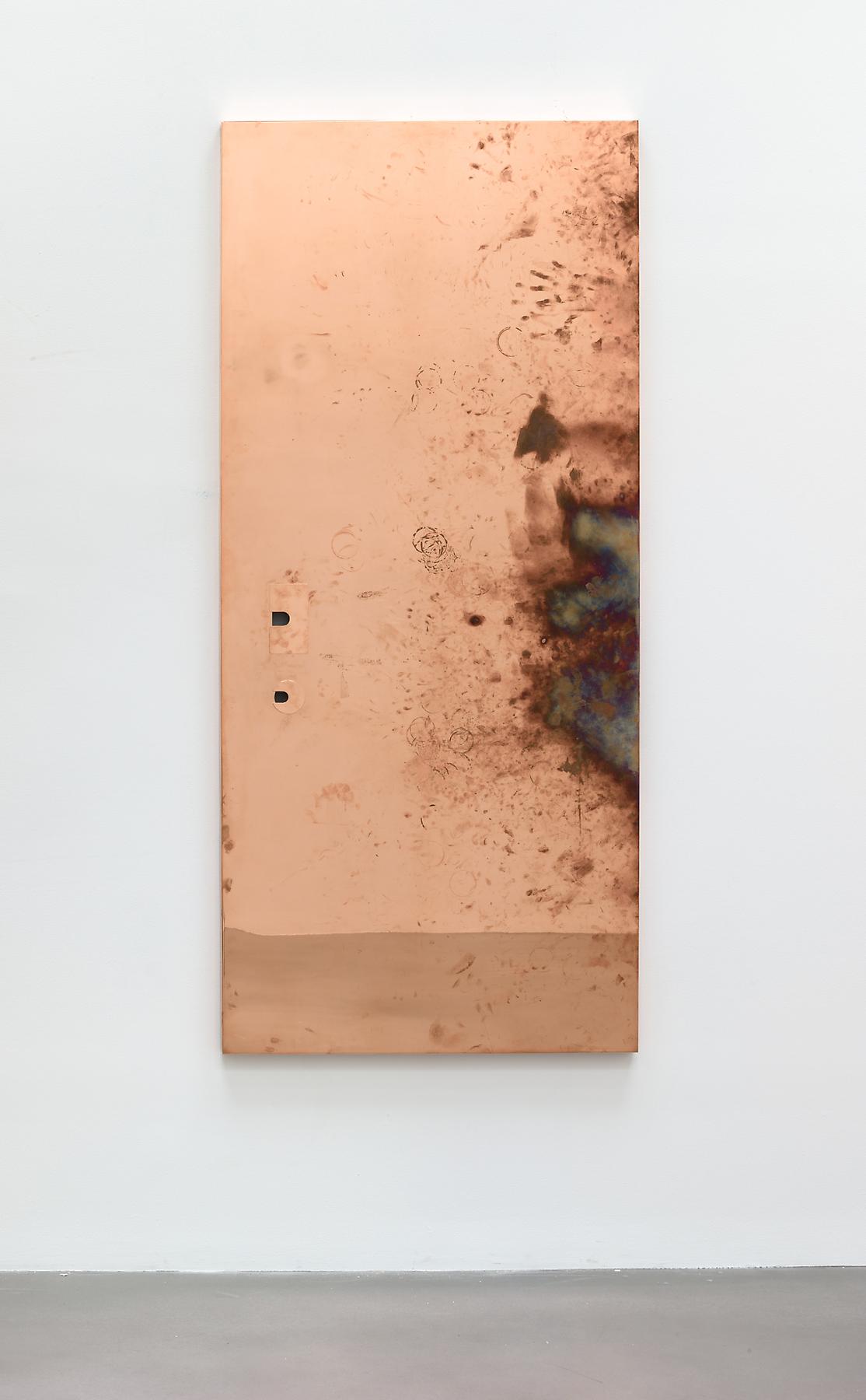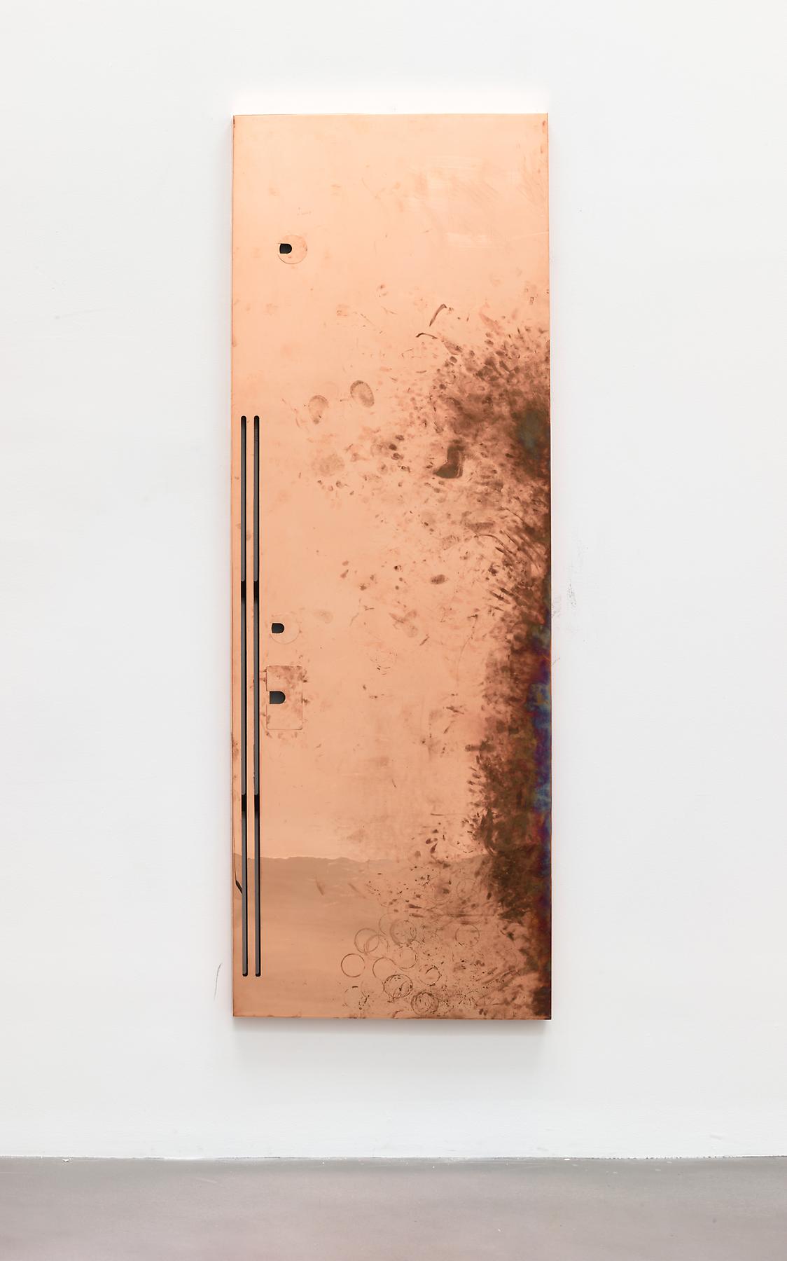 For this exhibition, Beshty installed polished raw copper sculptures, built exactly to the dimensions of the gallery’s working surfaces. Acting as the surfaces for the gallery desks during the duration of his summer exhibition A Machinery For Living, the highly reactive copper surfaces were inevitably tarnished as the staff used them throughout the summer, showing the wear that occurs to the material over a period of time. Beshty purposely used a highly reflective copper surface that would easily tarnish and rapidly show the effects of use, marked by human sweat and skin oils, coffee mugs, and other general wear and tear.