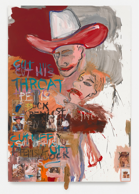 In addition to text, McCarthy also utilizes collage, so as to unite seemingly unconnected reference material together. These references include fashion magazines, images from the internet, and three-dimensional objects like synthetic wigs, a pair of boots, a coffee table, and soft toys wedged through the surface of the paintings. In this way, art history is woven through contemporary motifs, so that both the modern and the historical are cast in opposing roles in the same dramatic scenes. In addition to the completed works, on view in a neighboring room are new drawings related to these ongoing series of White Snow and Stagecoach.