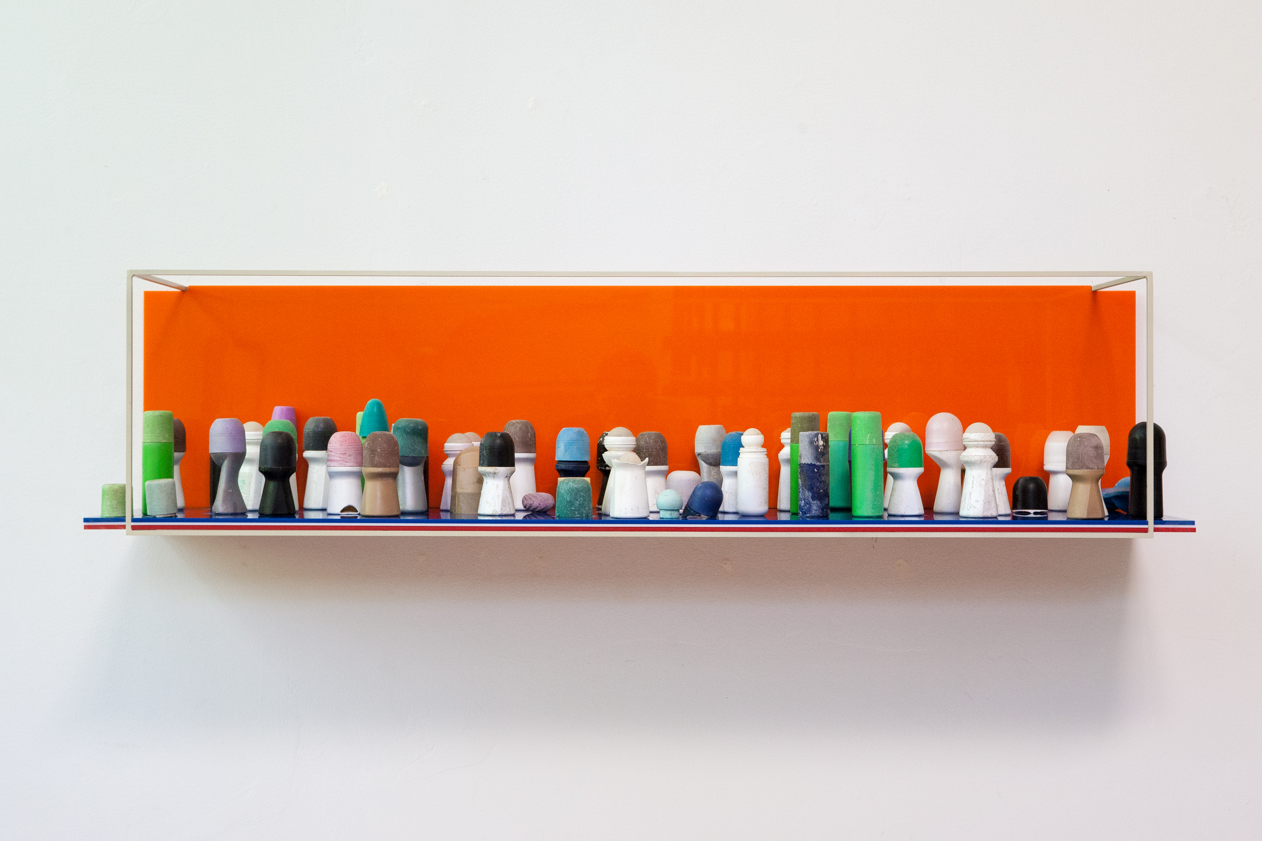 Another component Coolquitt underlines in his works is the potential histories his objects maintain, as well as create. Neo-Deo: Open Market, Open Vitrine, & Deo-Liberal Potentialities for example, is a cast acrylic and steel shelf, occupied by a random selection of mysterious objects resembling deodorant sticks, and which reminds one of the disarray of a well-stocked bathroom shelf. The artist embraces the uncertain here, emerging from the semi abstractness of the objects in form as well as their ambiguous stories.