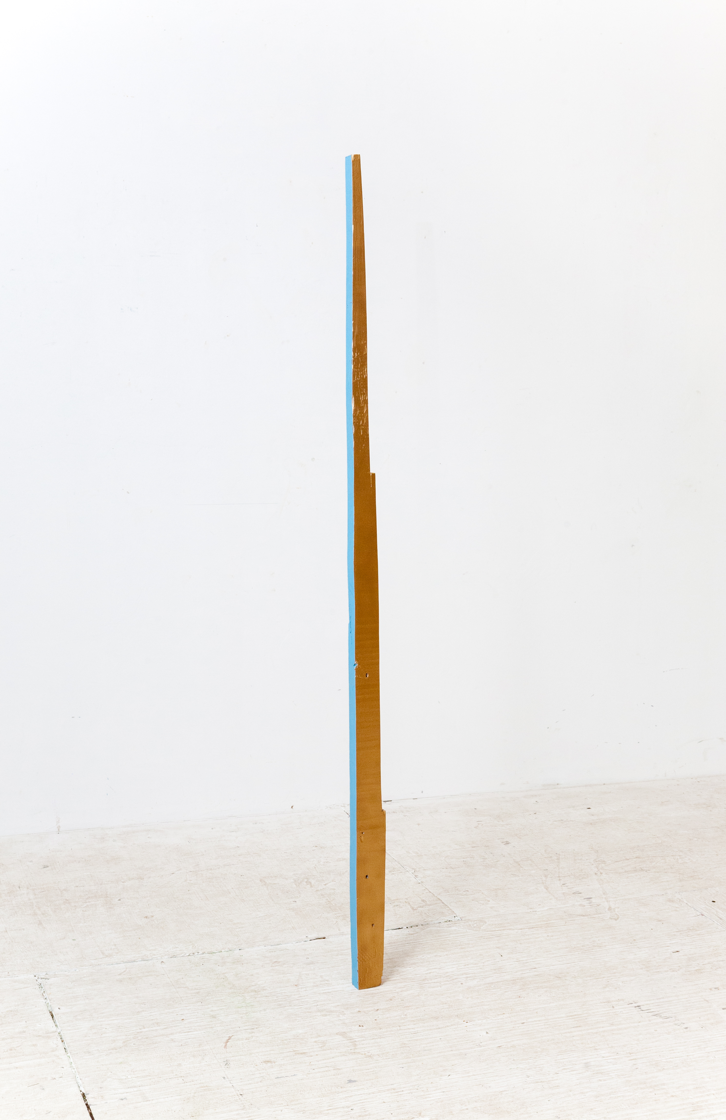 The title of the work, and the mutualist forms of these objects both indicate that this resemblance is not a coincidence. Momentum Stick: Pointer Helper, a wooden stick gradually thinning toward the upper side and painted blue on the other side, adopts a similar eerie filled obscurity, blossoming from the object’s unclear functional purpose and its current ambiguous potential.