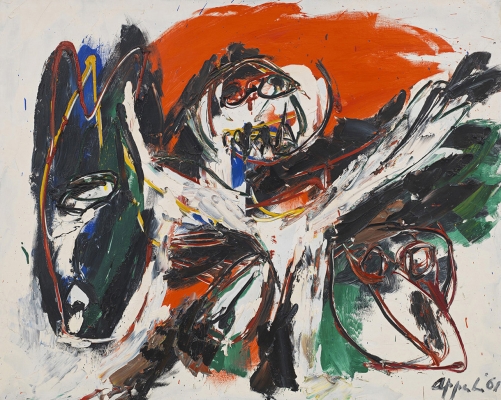 Appel shifted broadly over his nearly six-decade career, experimenting with a variety of different formal and informal elements, between abstraction and figuration and diverse media. Refusing to confine himself to any signature style or technique, he drew great inspiration from folk art and children’s drawings, as well works from the mentally disturbed. These drawings, he said, allowed him to free himself from what he had learned in his formal education.