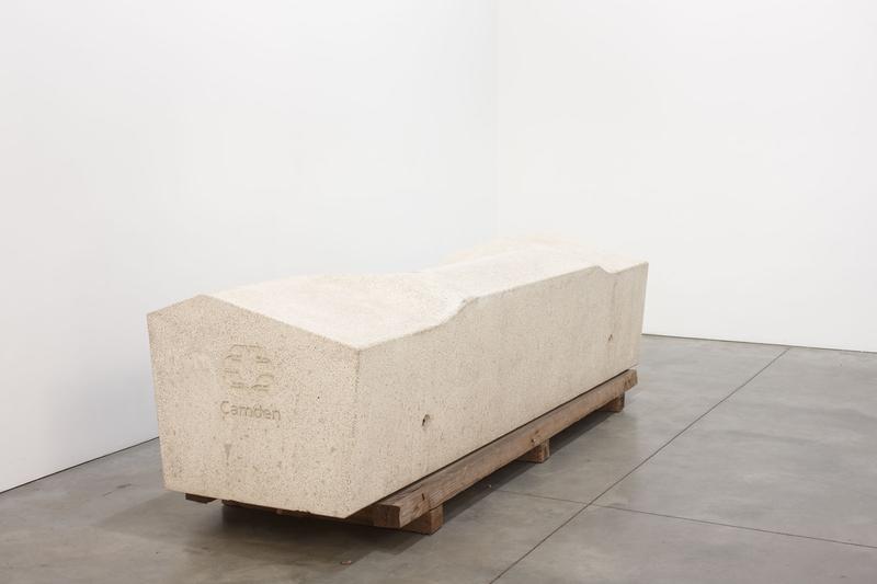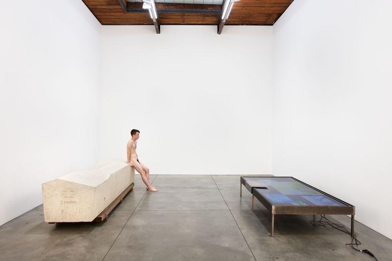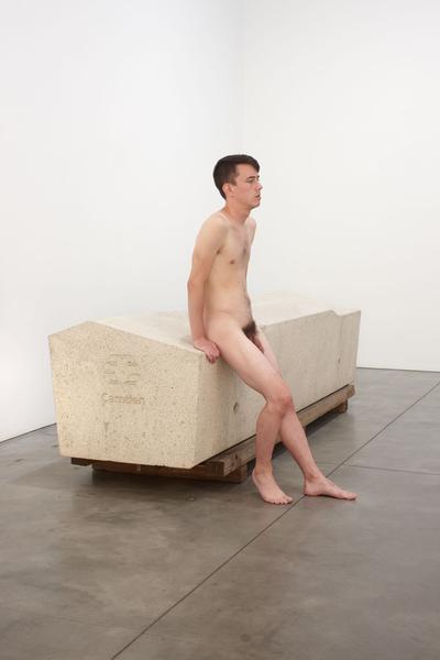 The large block of stone is a Camden Bench, a type of concrete furniture installed in Camden London in 2012, designed to deter undesirable street behavior such as sleeping, loitering, skateboarding, drug dealing, graffiti, and theft. It achieves this through its angular surfaces, the absence of crevices that can be used as hiding places, a weight so heavy that it can only be moved by a crane. The media listed by the gallery for the tabletop work is “Steel, flat screen, youth” as if the nude boy is actually considered an object used as media within the work.  Hiorns describes the description of “youth” as having a double meaning, so that the word youth can be also interpreted as a descriptive, or as if to say “here, ‘youth’ is present on the surface.”