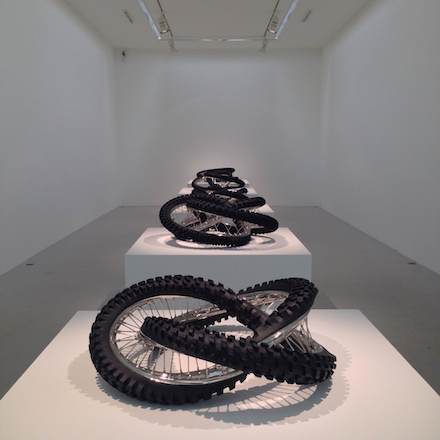 Along the same lines of religious iconography and architecture, Delvoye has shaped tires into shapes that resemble architectural features from religious buildings, twisting them into Gordian-like knots. A familiar reference to medieval metaphors regarding the infinite, the pieces seem to carve out a space for the same appreciation in a modern discourse, despite the limitations of their own banal cultural moorings. In a similar format, Delvoye is presenting one of his bent crucifixes, Double Helix Alternating Current 13cm x 15L, a double-helix pattern questioning relationships between concepts of religion, science, and faith.