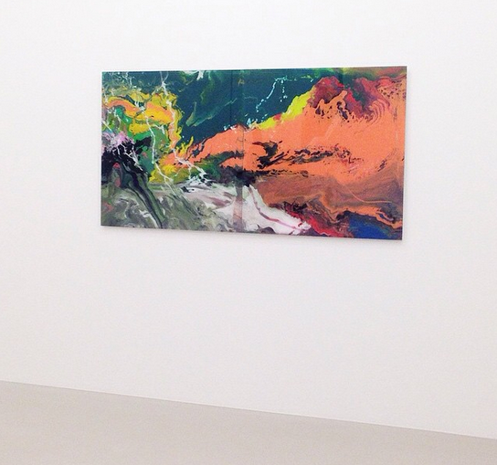 In his newest show, Goodman allows Richter the space to go in all directions at once, with a number of new works from various series on view, as well as a group of older works. Combining a number of the artist’s Strip pieces, deconstructed and endlessly reproduced slices of digital photography of his own works, with his Flow works, pieces of canvas across which paint is poured at the moment a glass surface is affixed to it, freezing the surface in mid movement.