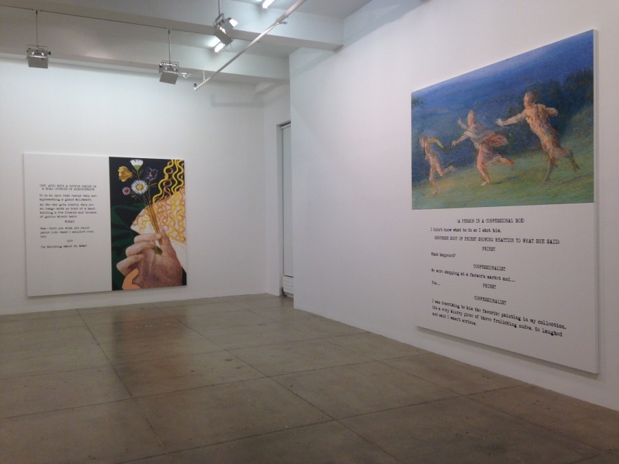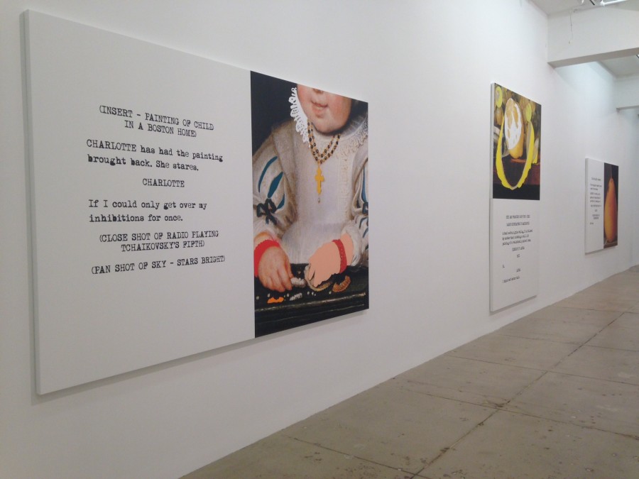 One of the most prominent names that defines the past 40 years of West Coast conceptualism, John Baldessari is currently presenting a new body of work at Marian Goodman Gallery. Titled Movie Scripts / Art 2014, the series resumes the pioneer’s investigation on the visual language of artworks and the possibility of a dialogue between images, words and cultural formats like film and literature. Baldessari, who has always been curious about the range text can explore in artistic expression, has not been hesitant about placing images next to sentences and written situations, often directly posing questions to the work or offering sarcastic alternatives to its surface level relationships.