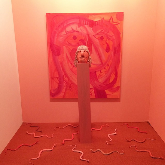 Back downstairs, Long Island gallery Easthampton Shed was presenting a booth focusing on a single environment built by Brian Kokoska. With red carpeting, columns and a single comical sculpture, the work was one of the more striking outliers in a fair that can often be defined by a certain material preoccupation.