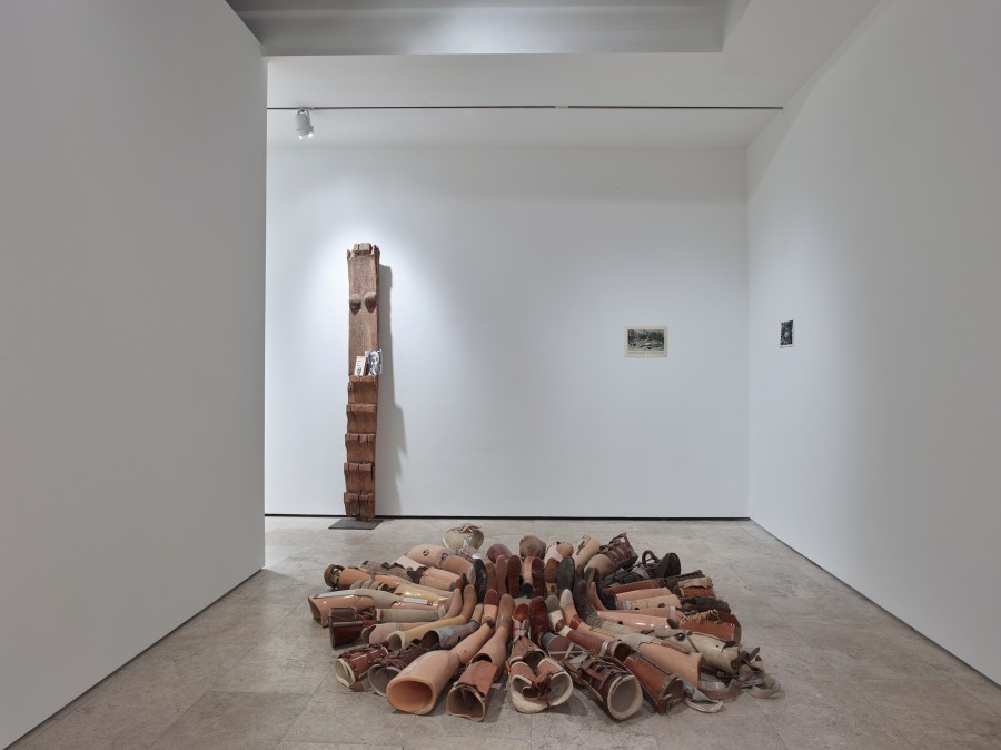 On the other hand, a wall piece including more than a hundred glass fragments which seem to belong to a church, and a series of collages of photographs and brooches, each titled Injury Reappropriated, strengthen the concept of deconstruction and impairment. Of the most striking pieces is Artificial Nature, a floor installation composed of thirty antique prosthetic legs from World War I and II, deliver an emotionally challenging yet oddly intriguing presence. The legs’ status as art objects and what they perpetuate as images of war orchestrate a peculiar sensation taken together.
