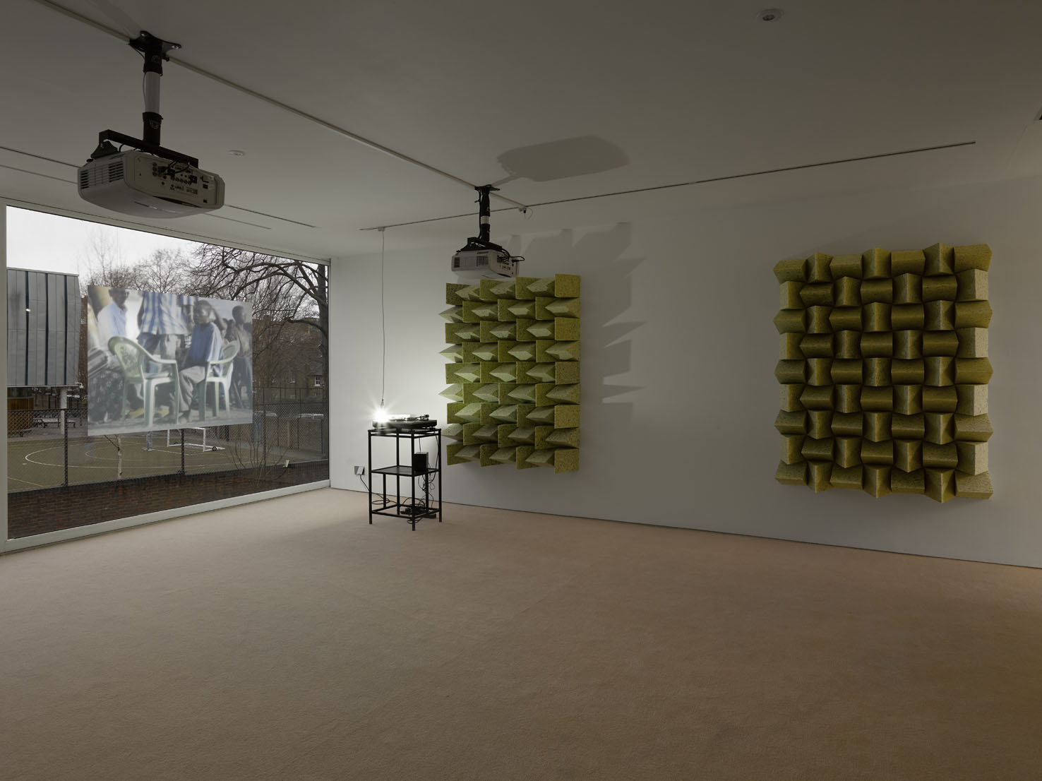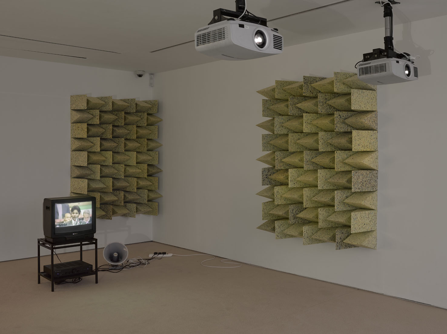 The titular work by British artist Haroon Mirza places two videos in conversation. In one video, the rhythmic drumming of a Muslim wedding in Kenya resounds, a suggestion of ritual and ceremony set against appropriated YouTube footage of a Lahore student competition for speech in the language of Urdu. This confusion of sounds reflects the confusion of aesthetic and cross-cultural interpretation, while referencing the immediacy of translation that sound carries beyond the conveyance of knowledge and understanding.