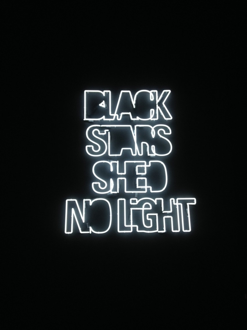 Black Stars Shed No Light is another example of the neon texts the artist is known for, especially when utilized as accompaniment to her video pieces. Here, the oblique text builds a contrast with the lit up neon work, striking as a silent yet grasping commentary on the video through a subtle composition of words.
