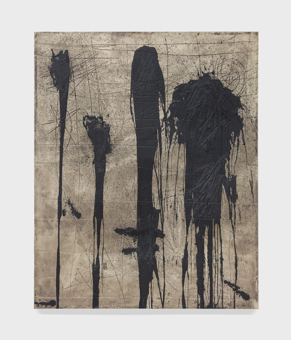 Johnson’s ability to attribute further content to otherwise mute materials has helped him become one of the key figures of the ‘post-black art movement’, and this exhibition at Hauser & Wirth emphasizes the artist’s interest in his core materials, among which bronze is the most common.  Aside from assemblies of mixed objects, bronze panels hung onto the walls contrast the image of the boy holding a gun with their abstract gestures.  Black soap, another material Johnson constantly returns to, appears on these panels, constituting what Johnson calls a “memorialization” of the creative process.