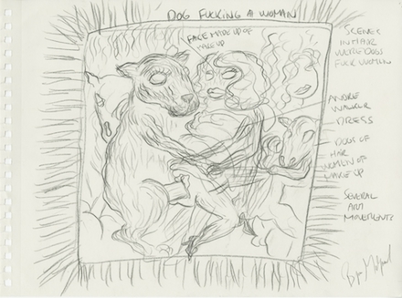 Collaborating artists include hair artist Bob Recine, fashion designer Andre Walker, furniture designer Kwangho Lee, make-up artist Kanako Takase, and artist Susan Cianciolo. The exhibition is made up of various artworks that orbit Breillat’s presence in the exhibition, including canvases adorned with paint and makeup, and other bizarre assemblages created by his fellow collaborators. Melgaard would make drawings and then hand them over to other artists to add their touches to the works, allowing various elements of his style to take on new life in others’ hands.