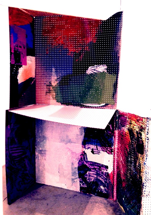 Also on view in the Project Space of James Fuentes Gallery is the work of artist Eric Mack. Perfectly paired with Debris, Mack presents a large-scale, sculptural, abstract painting that makes robust use of ready-made objects. Hypnotic patterned dots inside stacked peg boards illuminate layers of abstract multimedia paintings. Mack is definitely paving his own road in expanding the definition of painting here, with a piece that functions in both the two and three dimensional dialogues. Mack received his MFA from Yale University and is currently an Artist-in-residence at the Studio Museum in Harlem.