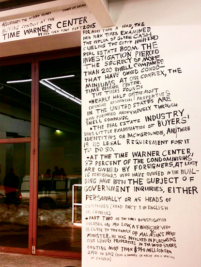 Yet simultaneously, the artist is willing to work far beyond facile nostalgia, digging into the actual economic realities New York’s real estate boom is built on.  The sense of buildings and land as a speculator’s game, or perhaps more explicitly, the speculation of space in New York City, takes on more sinister undertones in Holmqvist’s hand, noting the number of top-flight apartments and residences (helping to drive up rents in the city) held by a minuscule group of foreign shell corporations, major oligarchs and suspect international figures.  New York’s land worth, he points out, is partially built on the most unstable peaks of capitalism, often targeted at the highest tiers of the global elite, figures whose incomes and holdings may lean over into the shadowy ends of arms dealing, oil trading, or government corruption.