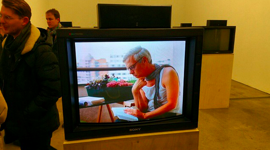 Joining these works are a series of video portraits of the artist shot by Rikrit Tiravanija, depicting Holmqvist at his home in Berlin.  Reading texts, shaving, or working, the videos capture the artist in a subdued space that carries an exceedingly strong clout in contrast with the bold-faced stances of the works in the adjacent rooms.