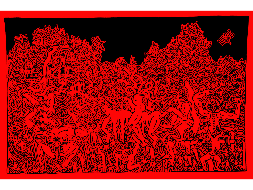 The exhibition draws its title from Haring’s occasionally catastrophic, even apocalyptic artistic vision, and the works reflect the darker shades of his work near the end of his career. While the text accompanying the show makes much of Haring’s love of duality and contrast, the paintings on view are decidedly diabolical. Canvases depict flurries of violence and crisis, demonic figures and extraterrestrial conquerors raging through clusters of Haring’s signature flailing bodies, juxtaposed with vague biblical iconographies and references to ancient cultures. Jumbo jets fly past winged pyramids, while in other works multi-headed characters devour human figures in hyper-loaded landscapes that recall the surreal style of Hieronymous Bosch.