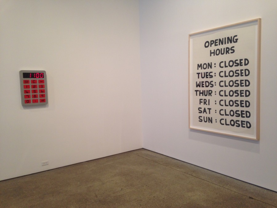 The artist’s Sculptural pieces, on the other hand, replicate two of the most basic electronic devices used in daily life, a landline phone and a subtractor. The dominancy of smart phones and computers have visibly afflicted these object’s circulation in contemporary culture, a point Shrigley seems to place at the core of the works, turning them into comically larger-than-life signifiers of a bygone era. Yet the objects are not merely dead images, and function quite well. Subtractor is open for viewer participation, in the event that any visitors have some sums they have to calculate, while Telephone is actually connected to the gallery’s main phone line. These objects manage to romanticize these fading gadgets while melding seamlessly into the broader aura of the show with their exuberant and slightly sarcastic execution.